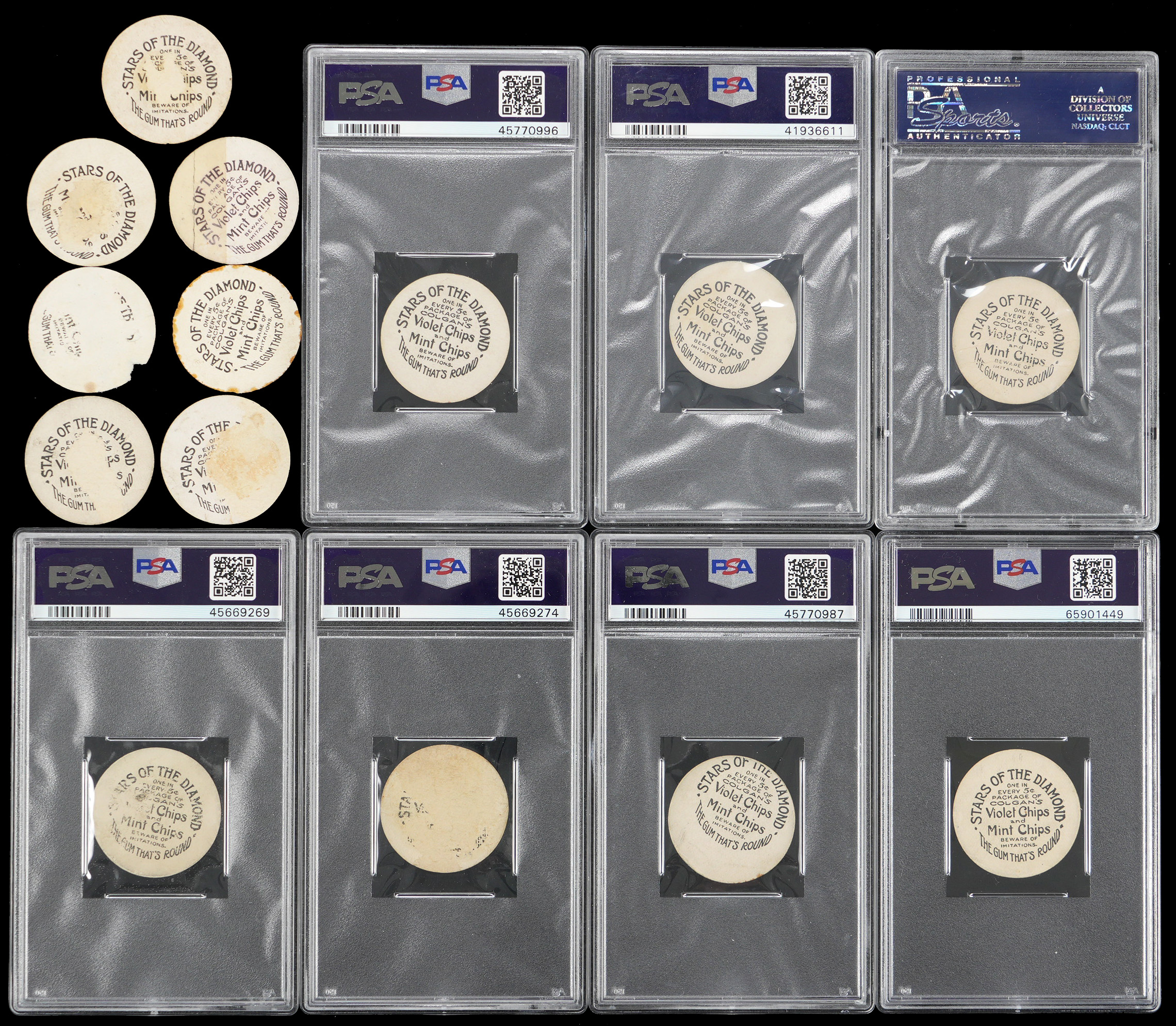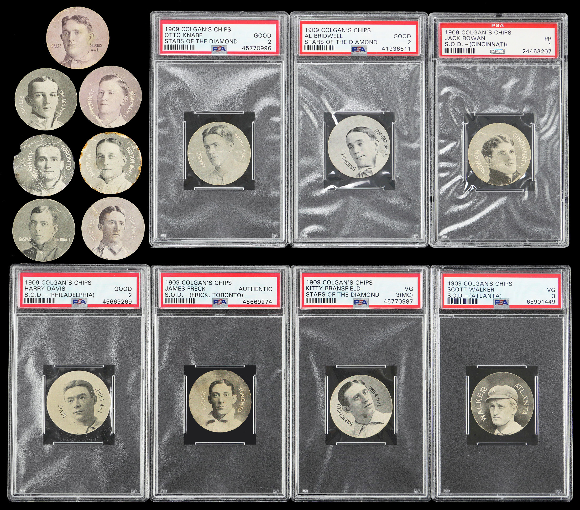 Timeless grouping of (14) 1909-1911 E254 Colgan’s Chips Stars of the Diamond singles with seven PSA graded. Includes: PSA VG 3: (2 cards, one qualifier) with Bransfield (mc), Walker; PSA GOOD 2: (3 cards) with Bridwell, H. Davis, Knabe; PSA POOR 1: Rowan; PSA Authentic: Freck; Ungraded: (7 cards, all PR with paper loss and/or residue) with Criss, Delahanty, Demmitt (New York), Gaspar, Mattern, Mitchell and Schulte.