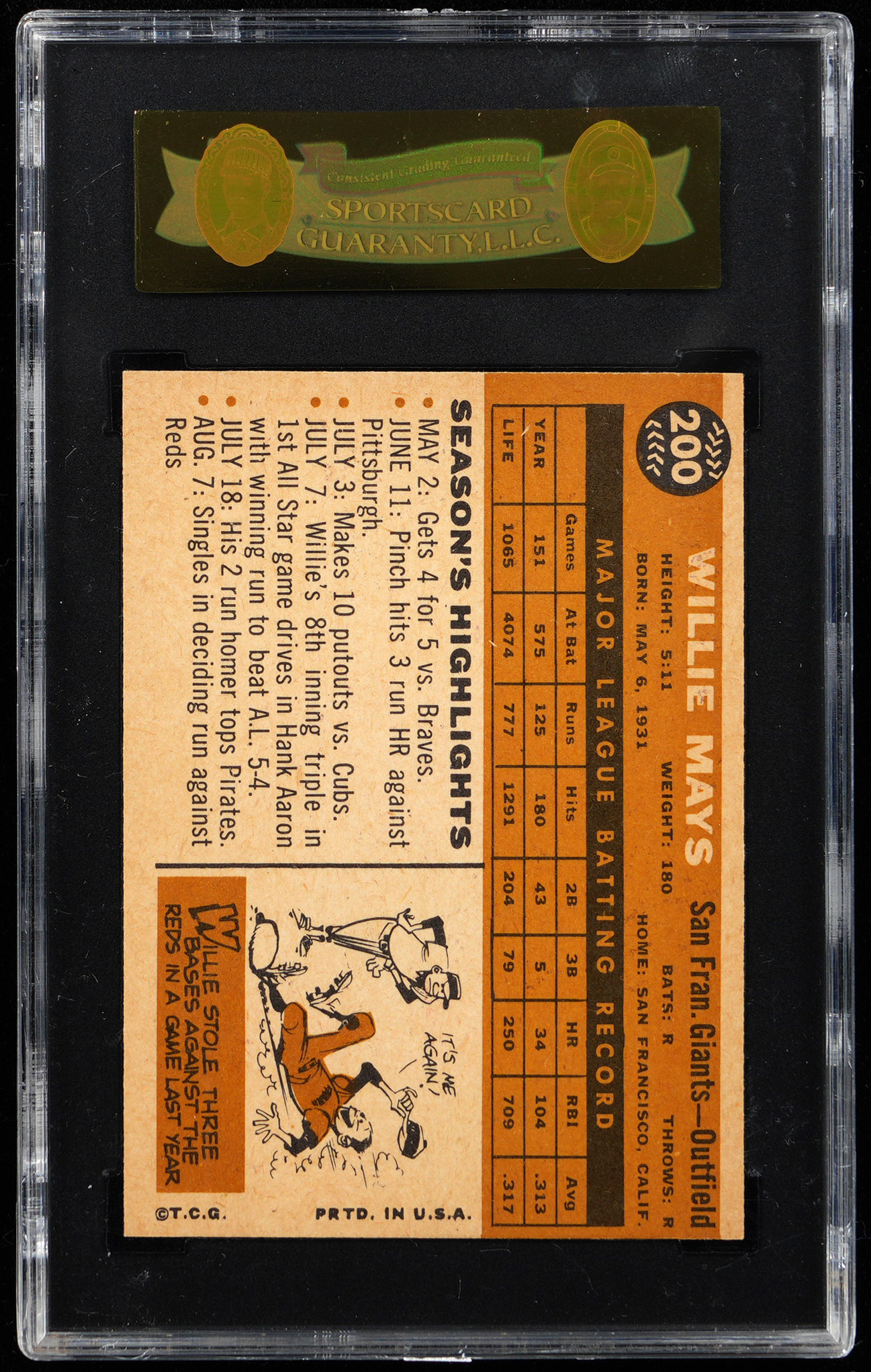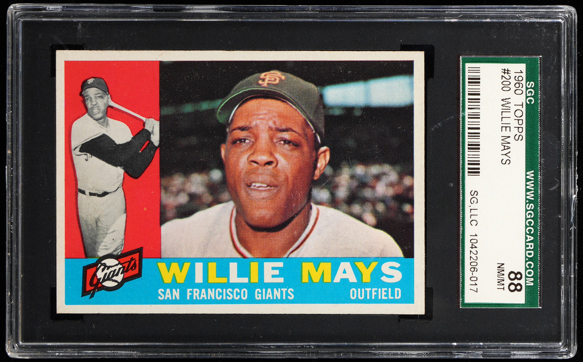 One Percenter Mays! Graded NM/MT 8 by SGC. Jaw-dropping 1960 Topps #200 Willie Mays showpiece. This five-tool San Francisco Giants legend is appropriately graded by showcasing four untouched corners, bright white edges and superior surface colors. The reverse is problem-free. Ranks in the upper 1% of all similar copies evaluated by the grading service!