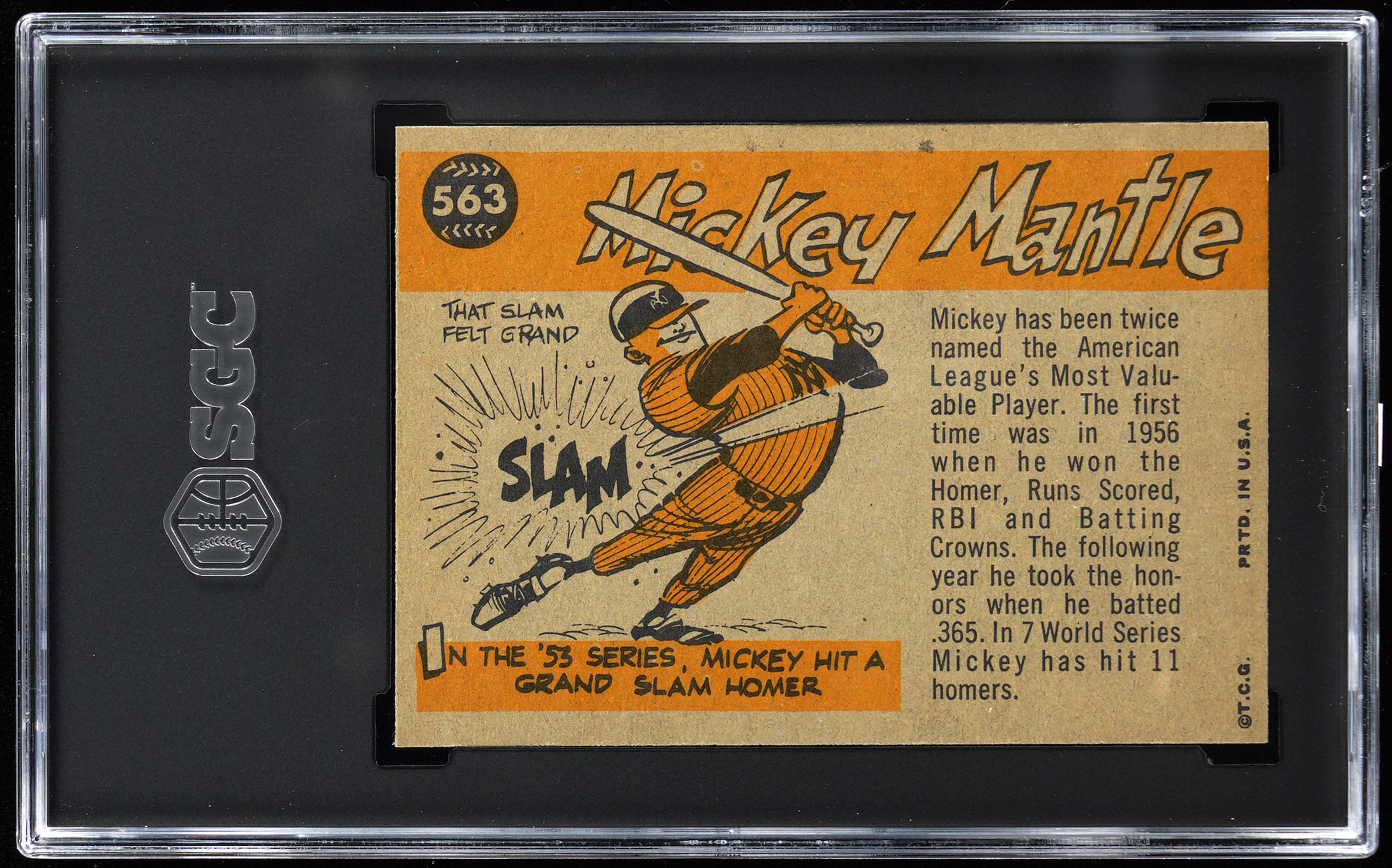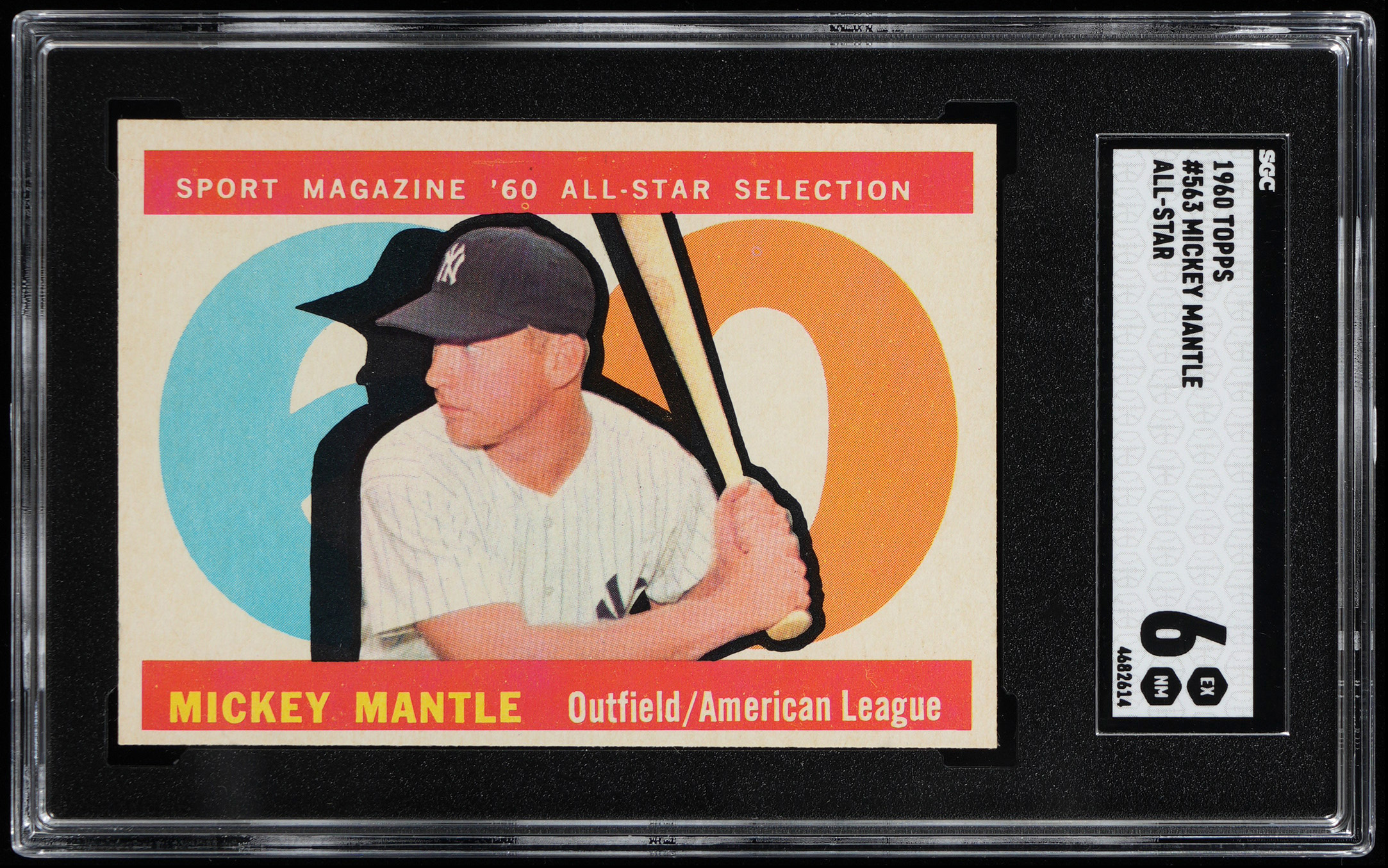 Graded EX/NM 6 by SGC. Mickey Mantle studies an incoming pitch from the left side on the offered 1960 Topps #563 All-Star card. This tougher high number is well deserving of its overall technical grade. New York Yankees Hall of Famer.