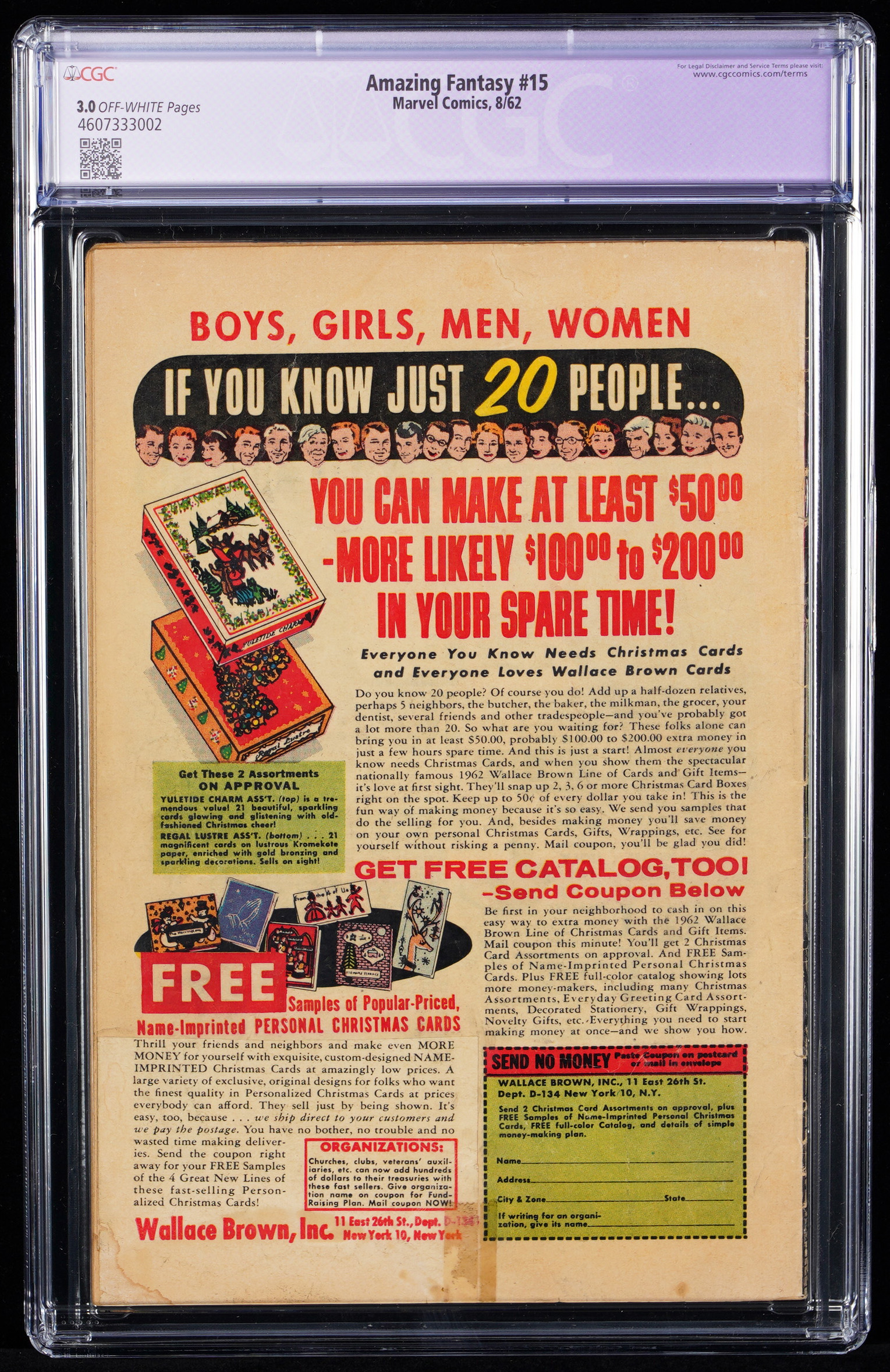 CGC has just returned this long-secluded 8/62 Marvel Amazing Fantasy #15 issue with a grade of 3.0, Off-White Pages, in a restored grade holder, with a Moderate C-3 description, indicating the level of restoration. Label notes are "Restoration includes: color touch, married pieces attached with glue, tear seals to cover. Stan Lee story, Steve Ditko art, Jack Kirby cover. Origin & 1st appearance of Spider-Man (Peter Parker). 1st appearance of Uncle Ben & Aunt May."