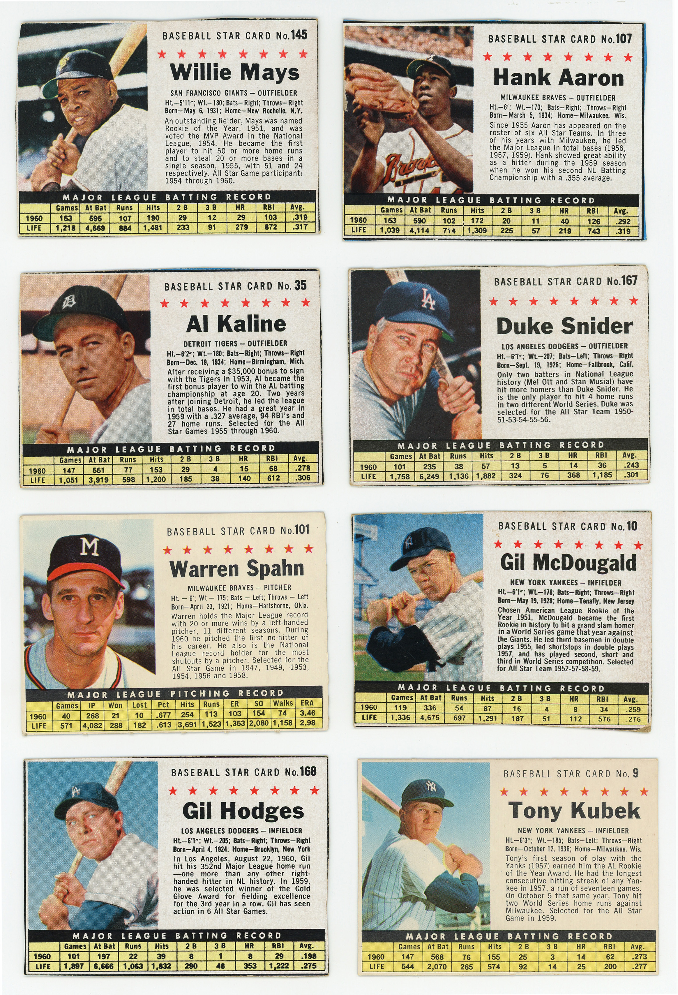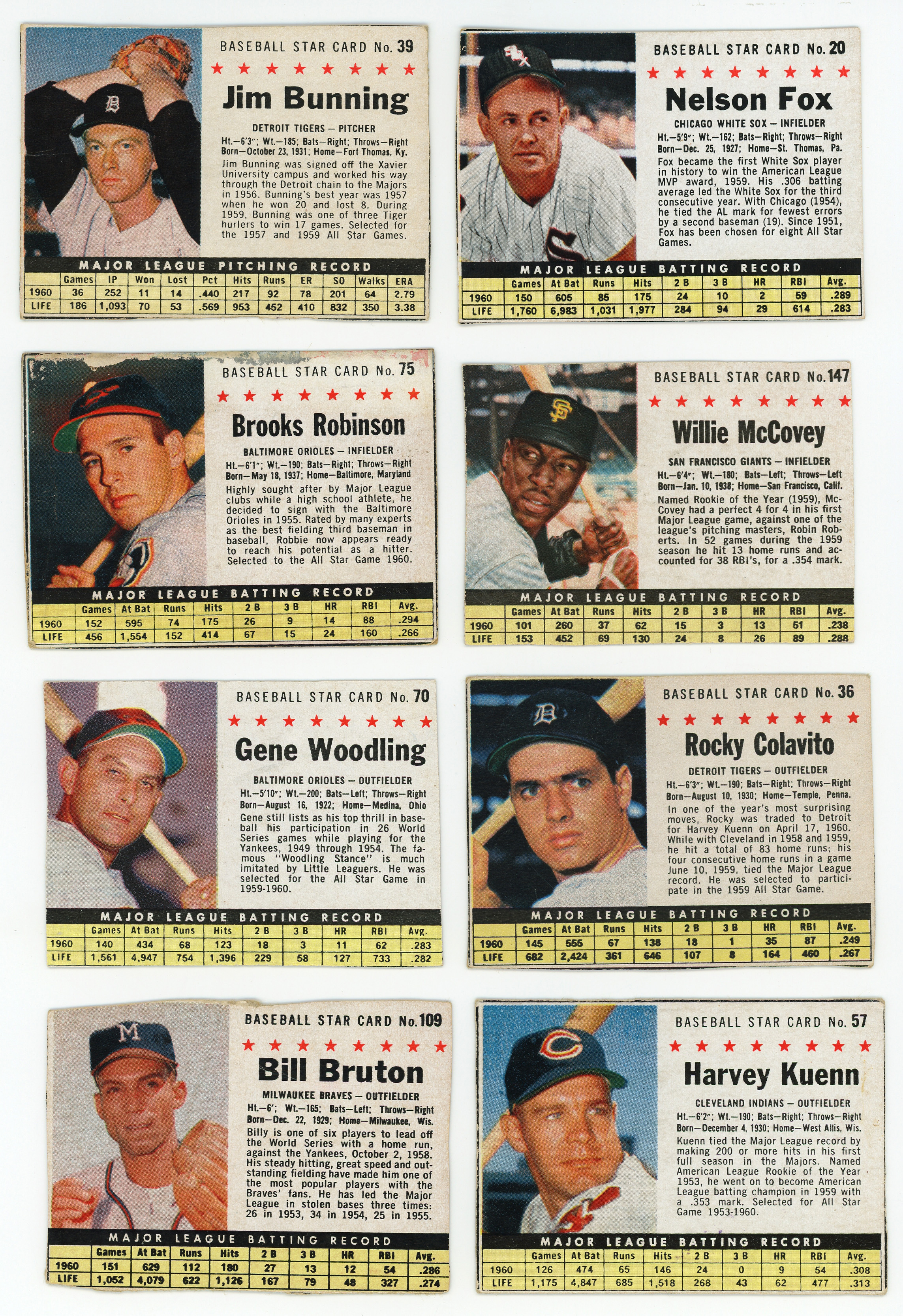 Box Version: (135 cards, average VG-EX with 10% reverse paper loss/residue or writing) with #10 McDougald (VG), #20 Fox (EX), #35 Kaline (EX), #36 Colavito (VG-EX), #39 Bunning (VG), #57 Indians (VG-EX), #70 Woodling (VG), #75 B. Robinson (GD), #107 Aaron (EX), #109 Bruton (GD, Braves), #145 Mays (VG), #147 McCovey (GD), #163 Roach (PR), #167 Snider (VG-EX), #168 Hodges (EX-MT);
