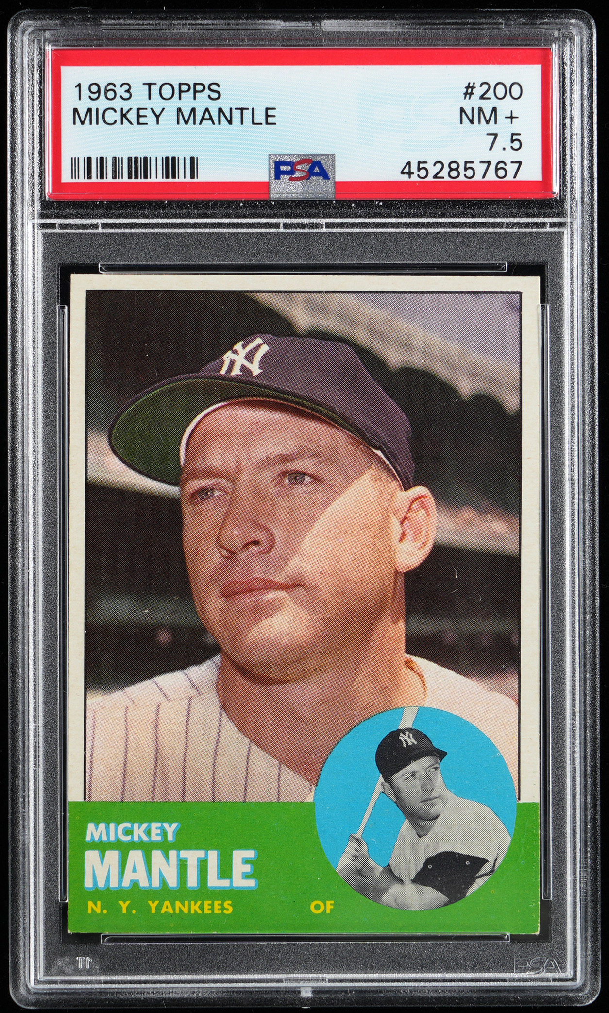 Graded NM+ 7.5 by PSA. Razor-sharp 1963 Topps #200 Mickey Mantle. This centered New York Yankees superstar is amplified by virtually untouched green-and-white corners/edges and lush surface colors. Definitely "one to get" for those pursuing the popular '63 edition. Ranks in the upper 6% of all similar copies evaluated by the authenticator.