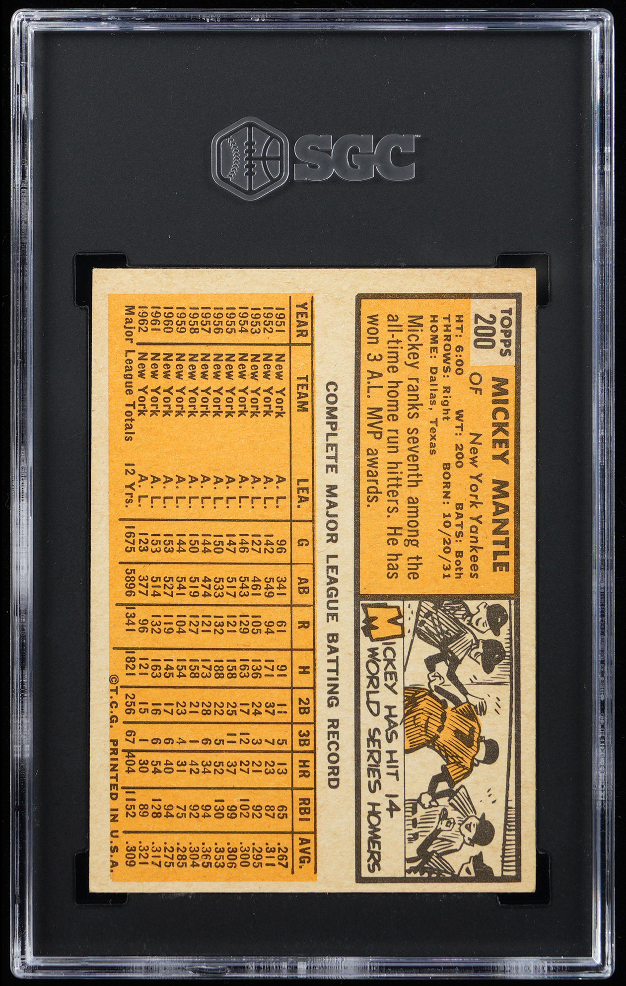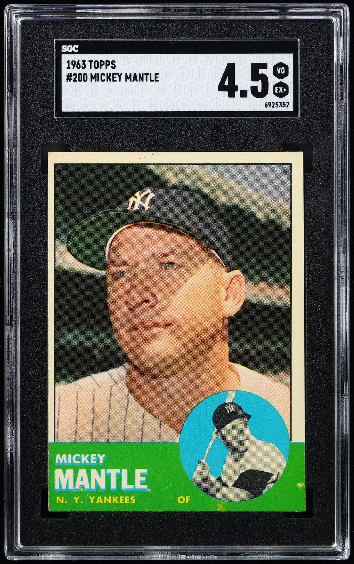 Graded VG/EX+ 4.5 by SGC. The switch-hitting Hall of Fame slugger is crowned by a Yankee Stadium backdrop on the offered 1963 Topps #200 trading card.