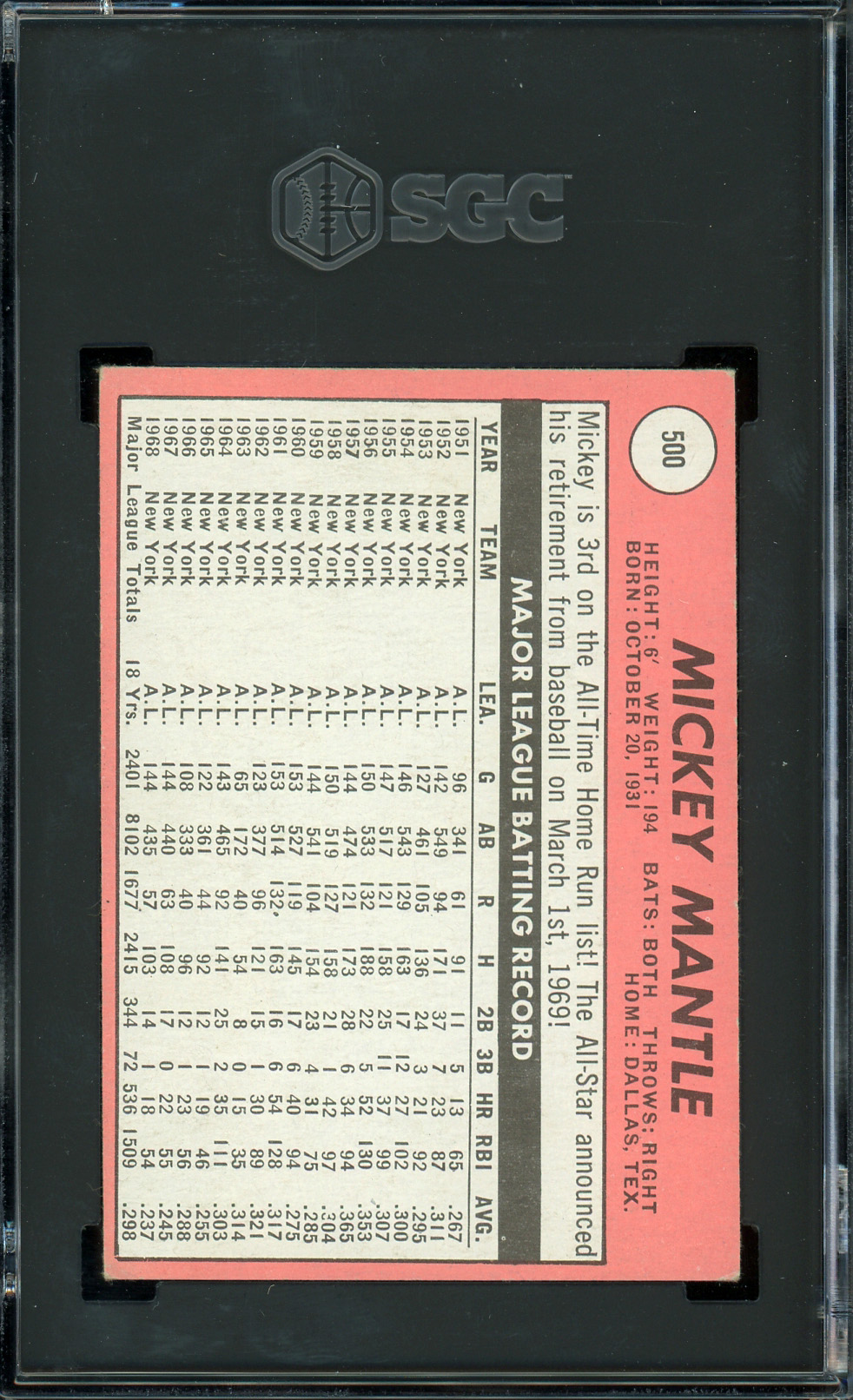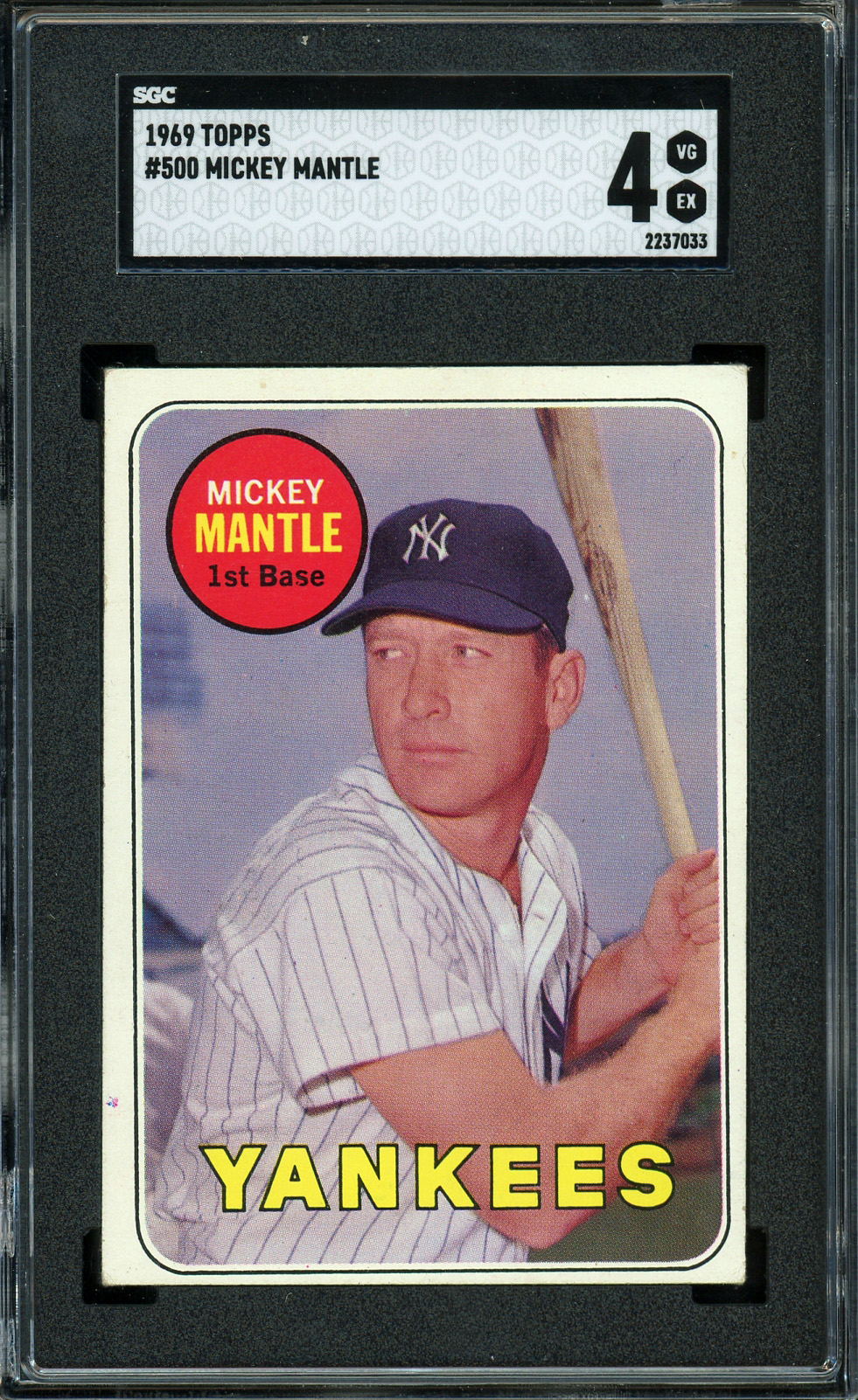 Graded VG/EX 4 by SGC. The conclusion of Mickey Mantle's record-shattering career is detailed on the offered 1969 Topps #500 gum card. New York Yankees Hall of Fame legend.