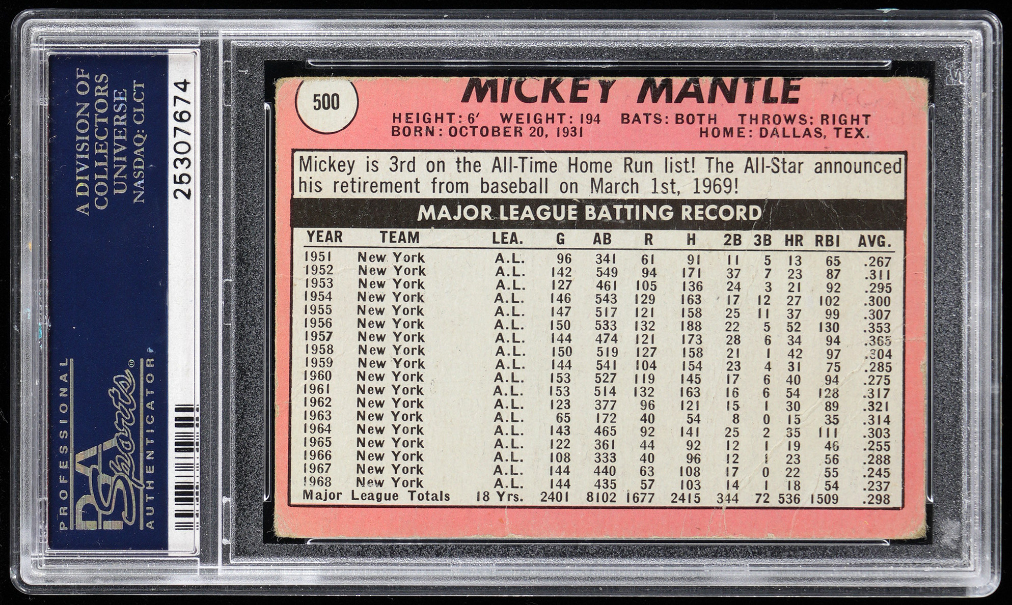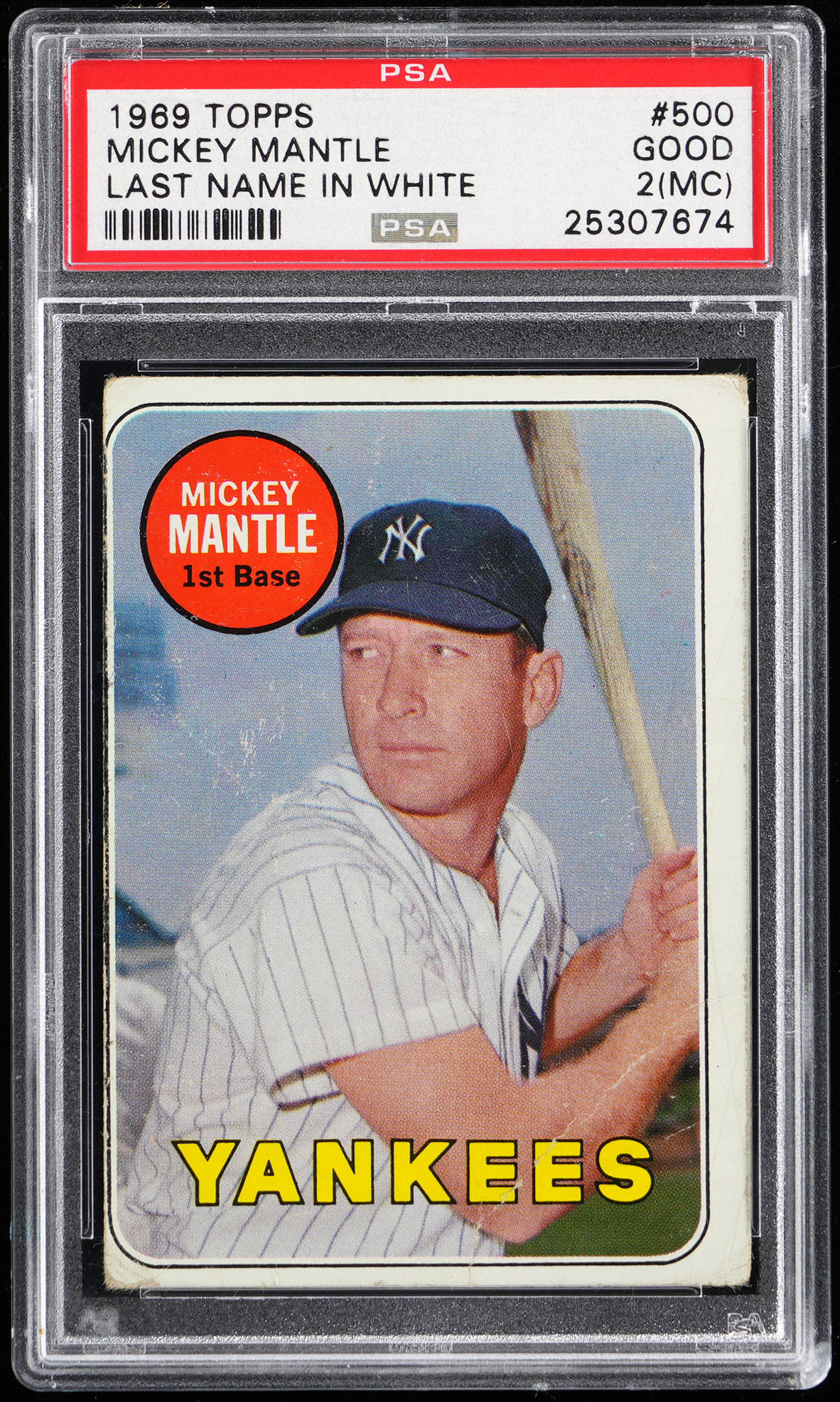 Master Set Collectors! Graded GOOD 2 by PSA with an (mc) qualifier. Acclaimed 1969 Topps #500 Mickey Mantle White Letters variation.