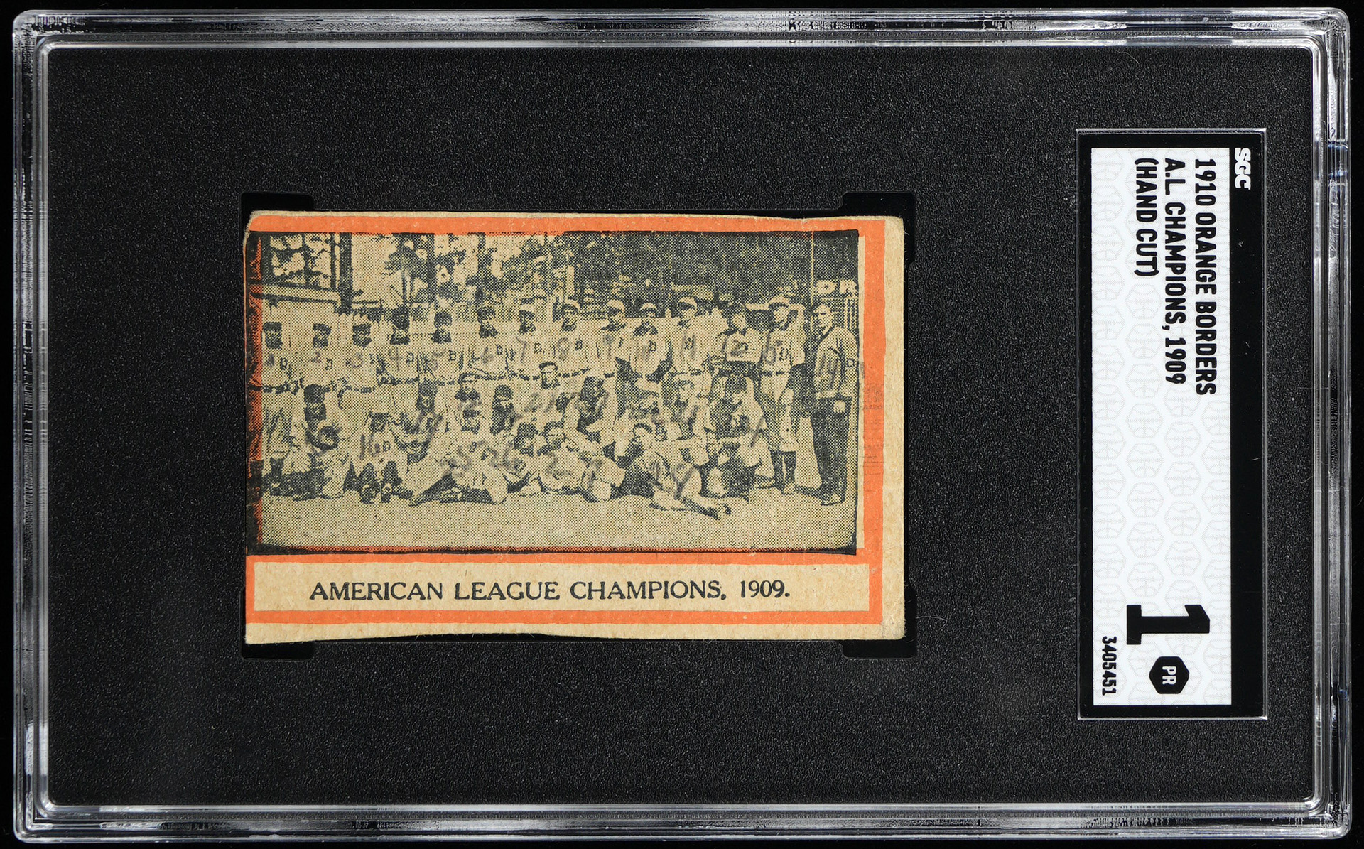 Graded POOR 1 by SGC. The 1909 American League Champion Detroit Tigers are celebrated on this exceptionally difficult 1910 Orange Borders example. Only 19 total copies of this team composite have been evaluated in any condition! This recently uncovered find pictures Hall of Famers Ty Cobb, Sam Crawford, Hughie Jennings and 21 other stars. The antique cardboard was culled from an “American Sports Candy and Jewelry” box and displays very light pencil writing on the blank reverse. The front is mostly clean and very light back creasing does not break the front surface.