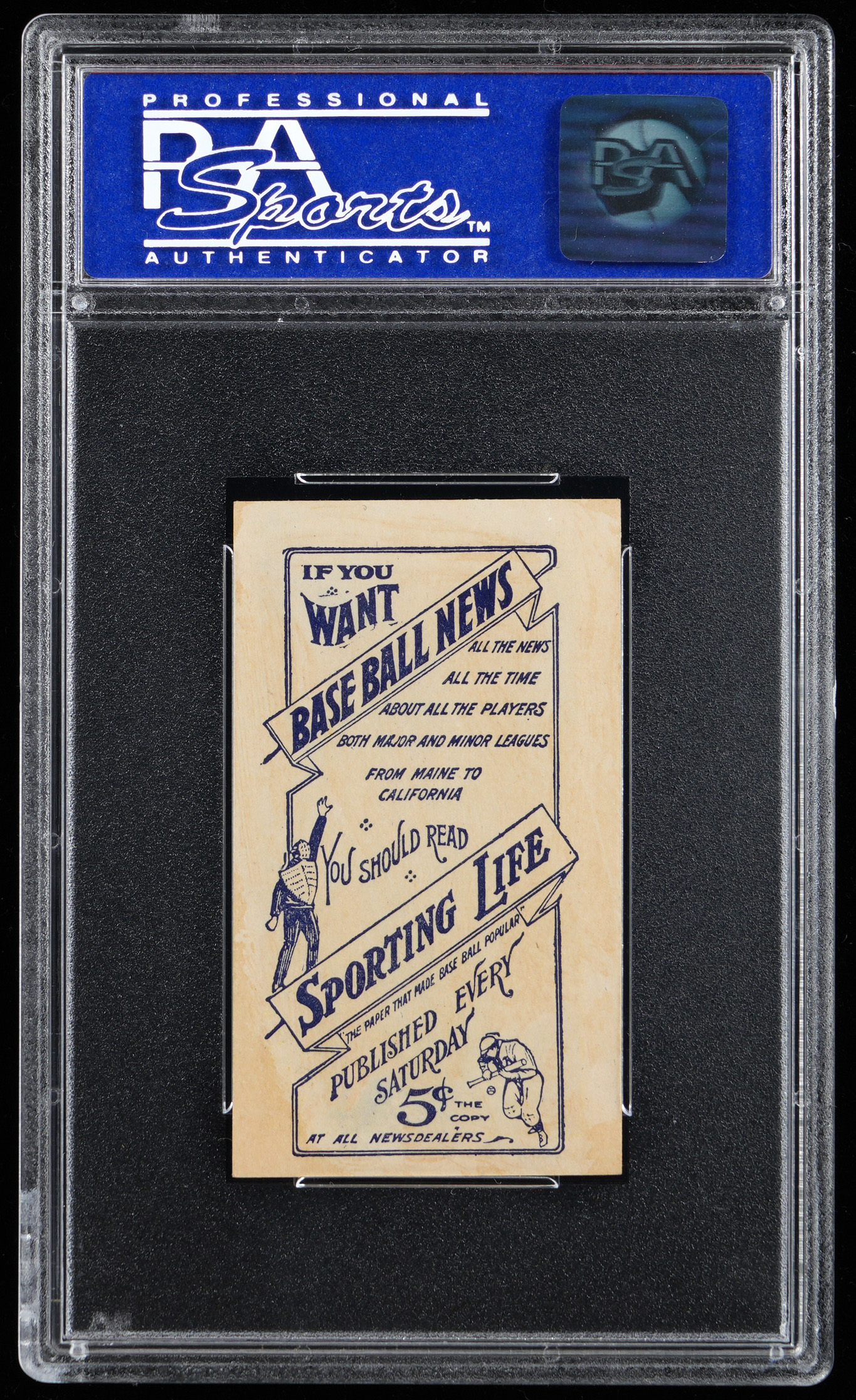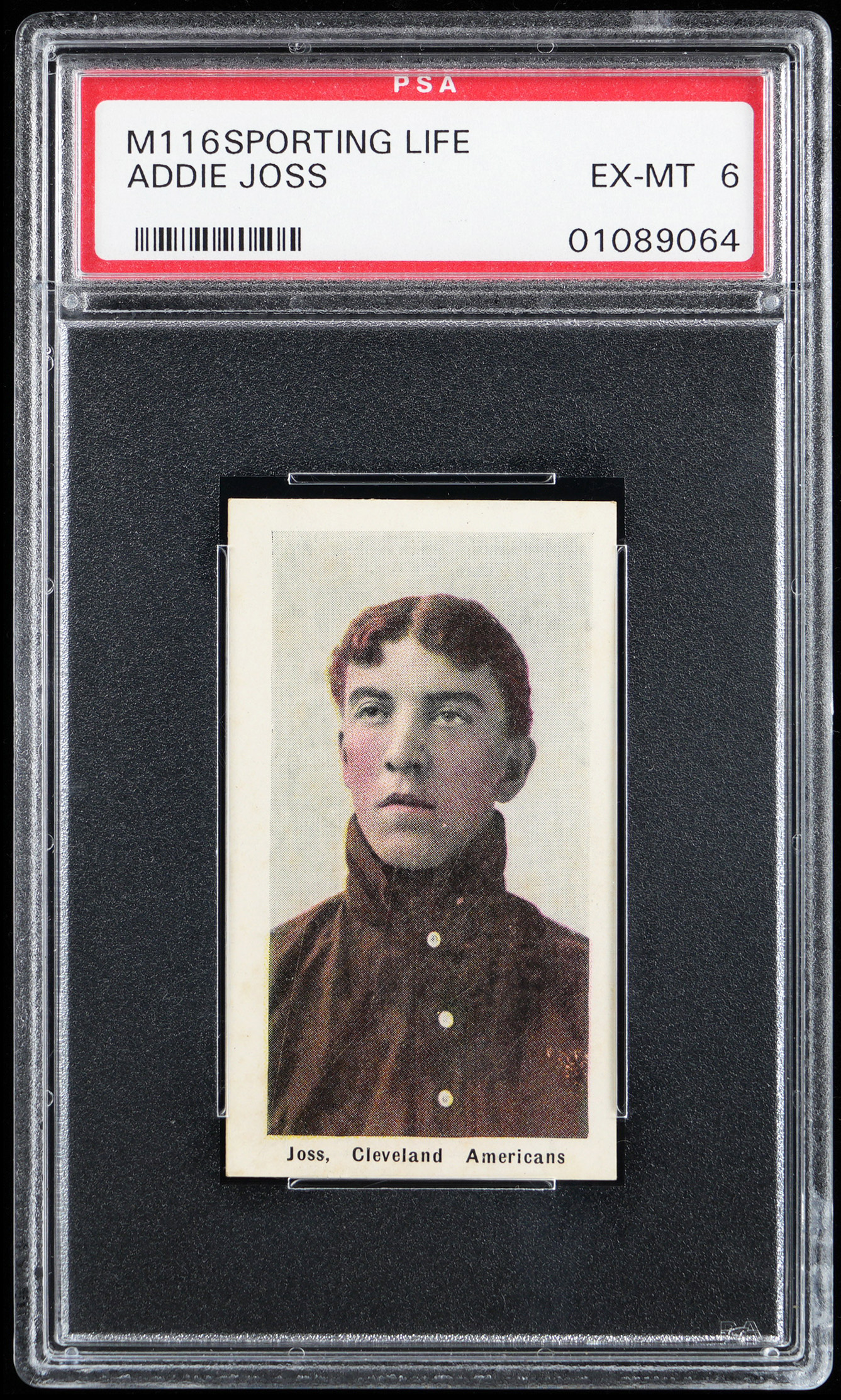 The Human Hairpin! Graded EX-MT 6 by PSA. Cleveland Naps Hall of Fame pitcher Adrian "Addie" Joss. The doomed legend is captured shortly before his untimely death in April 1911 on this haunting portrayal that showcases strong corners, creamy edges and strong front/back colors with striking player accents. Part of a larger 1910-1911 M116 Sporting Life near set break available throughout this auction.