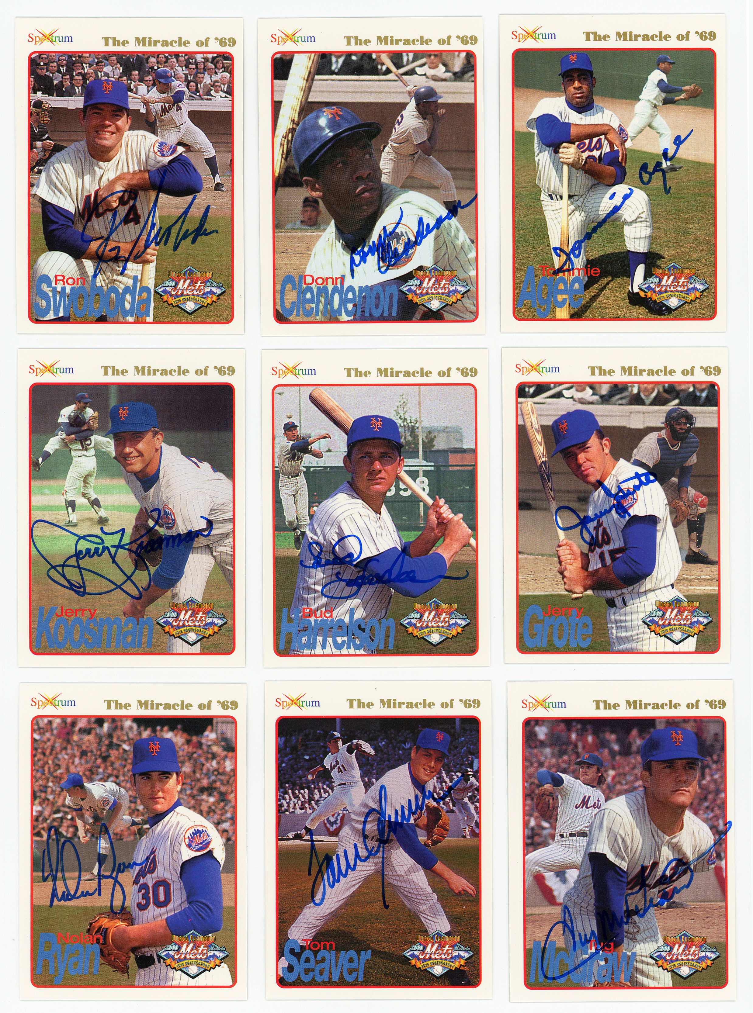 Signed cards include Nolan Ryan, Tom Seaver, Tug McGraw, Tommy Agee, Cleon Jones, Jerry Koosman, Bud Harrelson, Jerry Grote, Rod Swoboda, Don Clendenon, Art Shamsky, Ed Kranepool, Ron Taylor, Gary Gentry, Ken Boswell, Ed Charles, J.C. Martin, Al Weiss, Jack DeLauro, Duffy Dyer, Wayne Garrett, Jim McAndrew, Rod Gaspar, Don Cardwell and Bob Pfell,