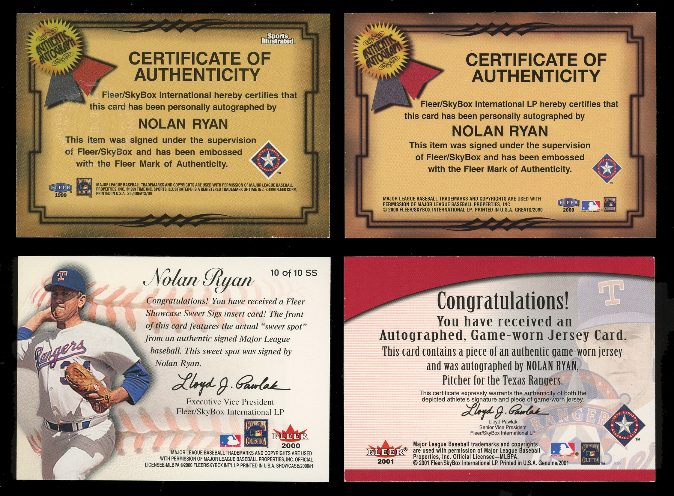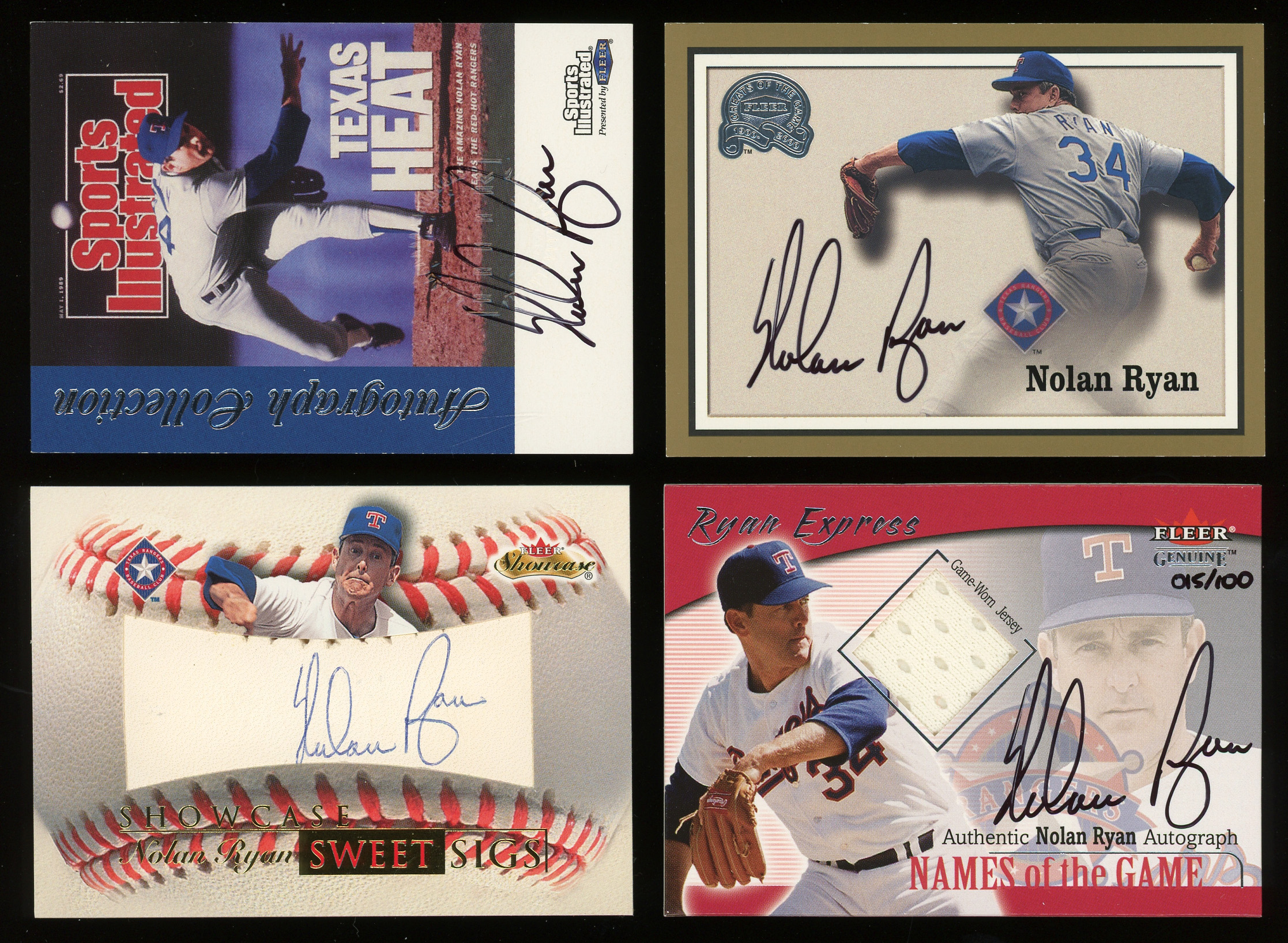 Extreme Texas heat fires with the offered quartet of 1999-2001 Fleer Nolan Ryan certified autograph cards. The following "on card" signatures are present: 1999 Fleer/Sports Illustrated Autograph Collection, 2000 Fleer Greats of the Game, 2000 Fleer Showcase Sweet Sigs #10 and 2001 Fleer Genuine Names of the Fame Auto/Jersey (#/100).
