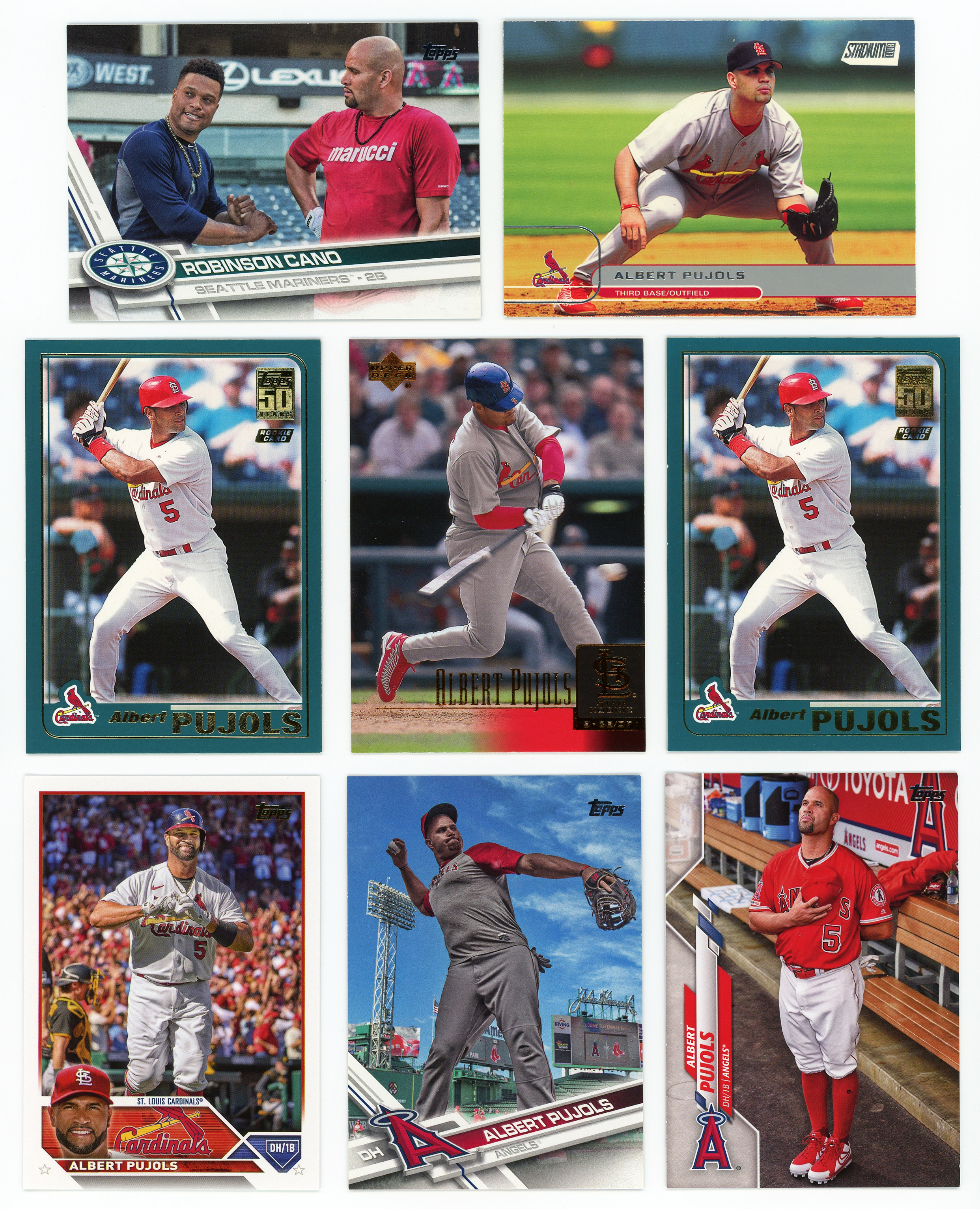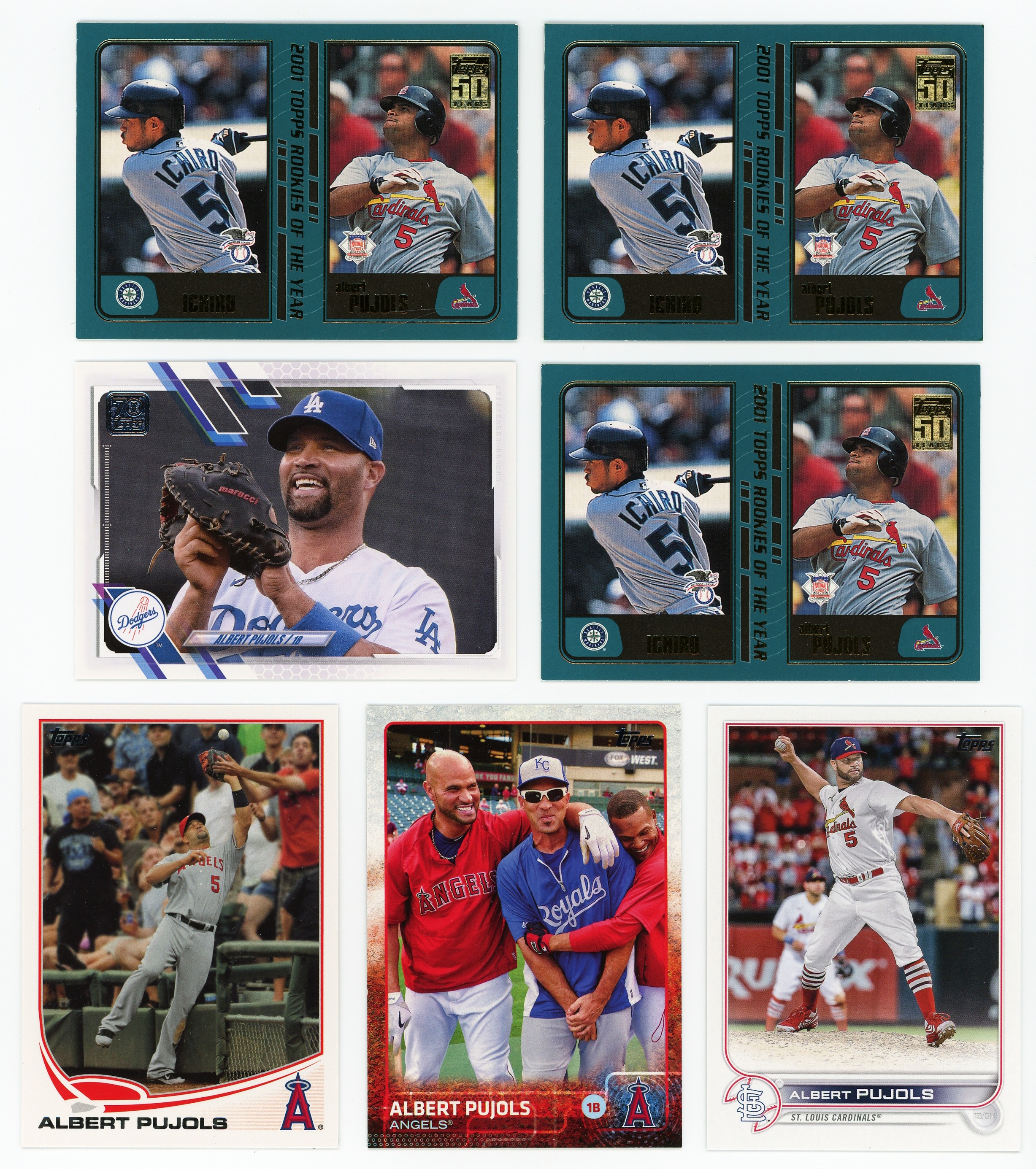 “The Machine” runs on all cylinders with the offered 2001-present Albert Pujols player collection of (181) cards featuring a myriad of rookies, shortprints and super shortprints. This future St. Louis Cardinals Hall of Famer is highlighted by the following: Rookies: (7 cards) with 2001 Stadium Club #5, (3) 2001 Topps Traded #T99 with Ichiro, (2) 2001 Topps Traded #T247, 2001 Upper Deck #295; Shortprints/Variations: (18 cards) with 2012 Topps #331 Pujols SP, 2013 Topps #350 SP, 2015 Topps #600 SP, 2016 Topps #500 SP, 2017 Topps #380 SSP, 2017 Topps #641 Cano (with Pujols) SSP, (2) 2018 Topps #582 SP, 2019 Topps #437 SP, 2020 Topps #497 SP, 2020 Topps #497 SSP, 2020 Topps Update #267 SP, 2021 Topps Update #200 SP, 2021 Topps Update #200 SSP, 2022 Topps #237 SP, 2022 Topps Update #300 SP, 2022 Topps Update #300 SSP and 2023 Topps #5 SSP.