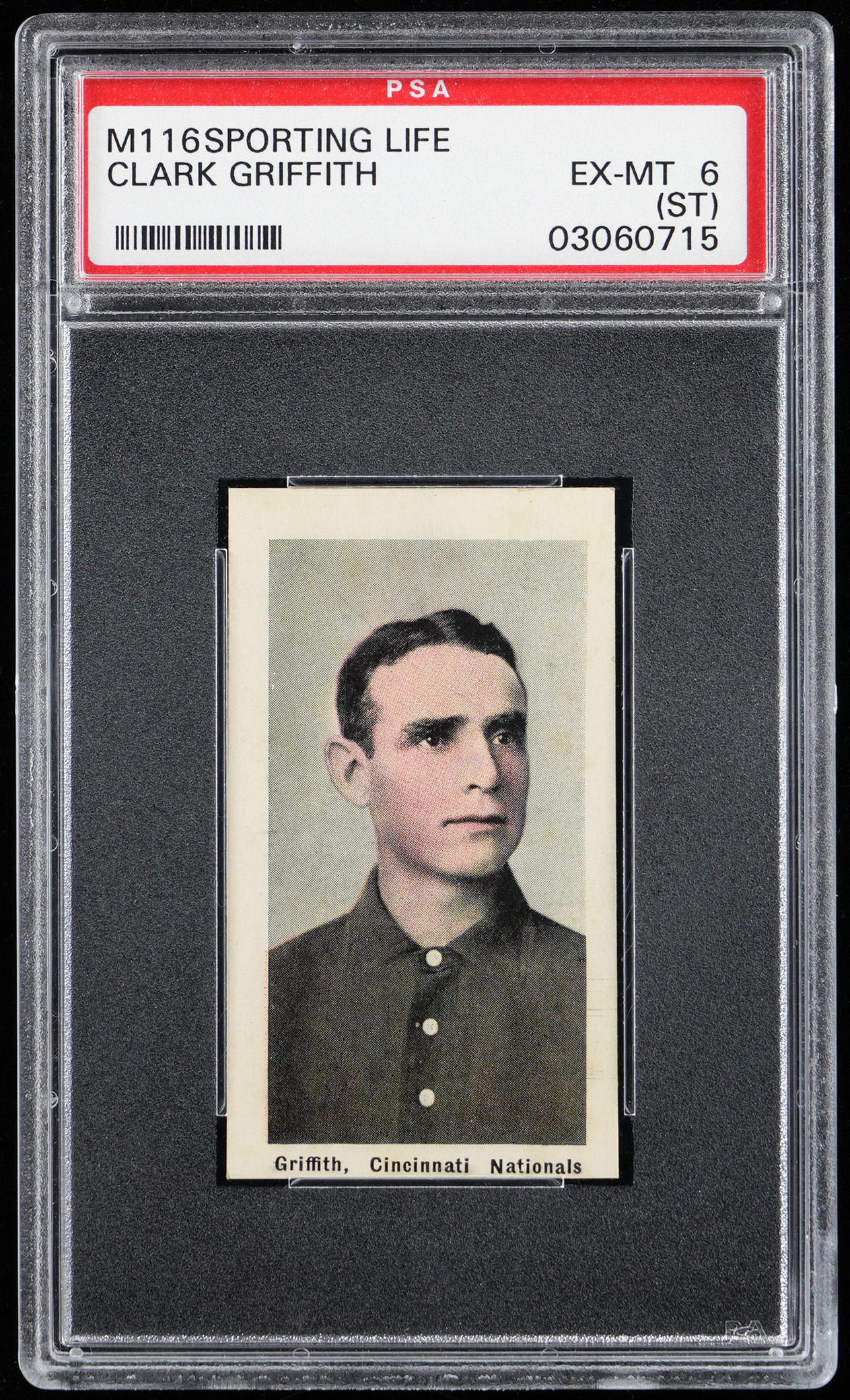 The Old Fox! Graded EX-MT 6 with an (st) qualifier. Cincinnati Reds Hall of Fame pitcher Clark Griffith. Part of a larger 1910-1911 M116 Sporting Life near set break available throughout this auction.