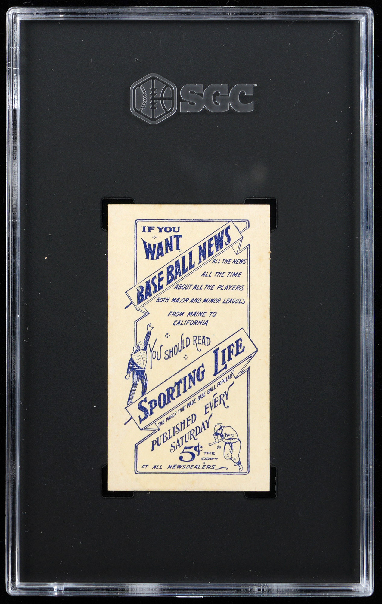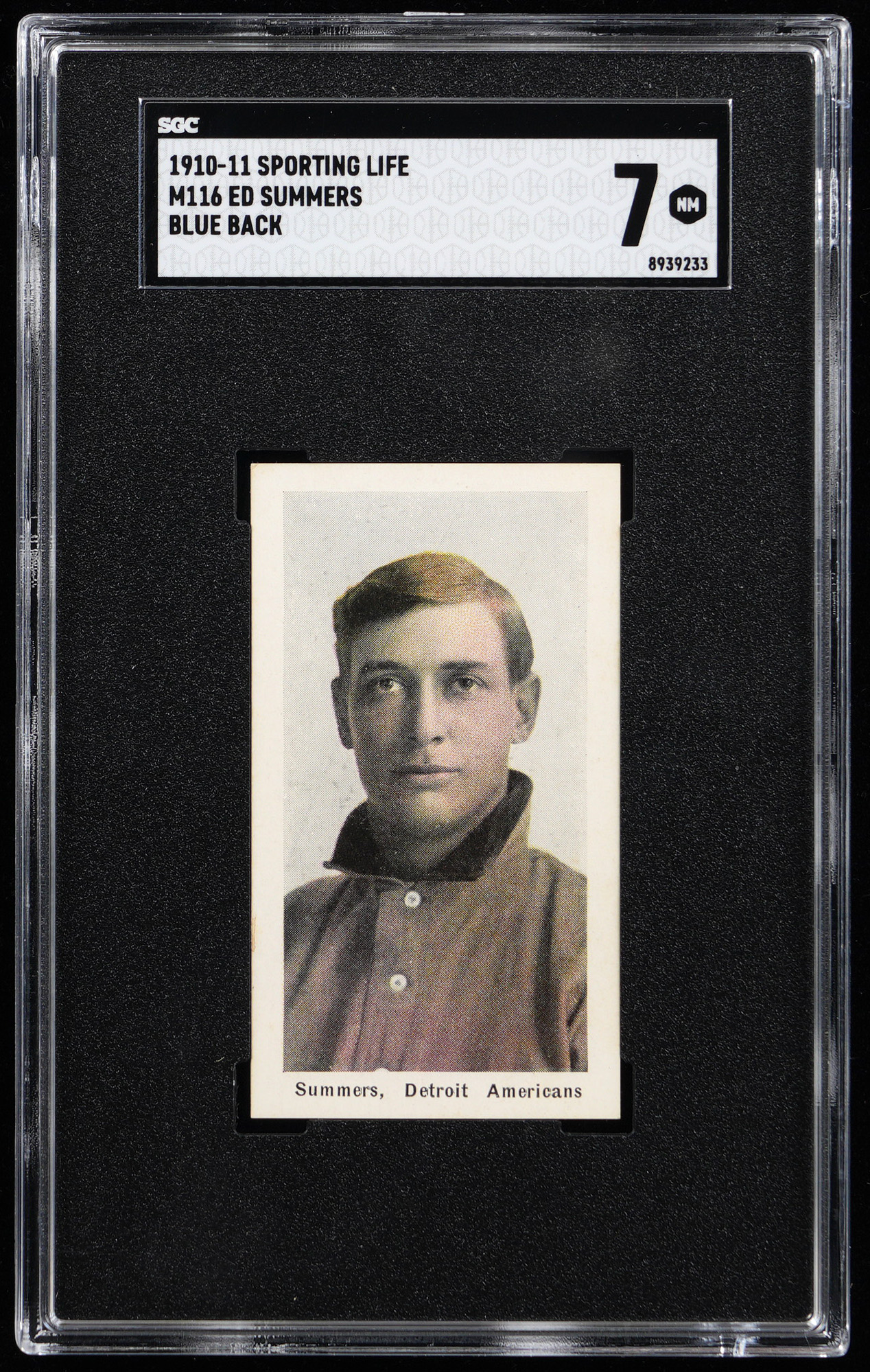 Graded NM 7 by SGC. Detroit Tigers pitcher Ed Summers. Of the 12 total copies judged by the grading service, this uncommon common ranks as 1 of 3 at the grading tier with none better. Part of a larger 1910-1911 M116 Sporting Life near set break available throughout this auction.