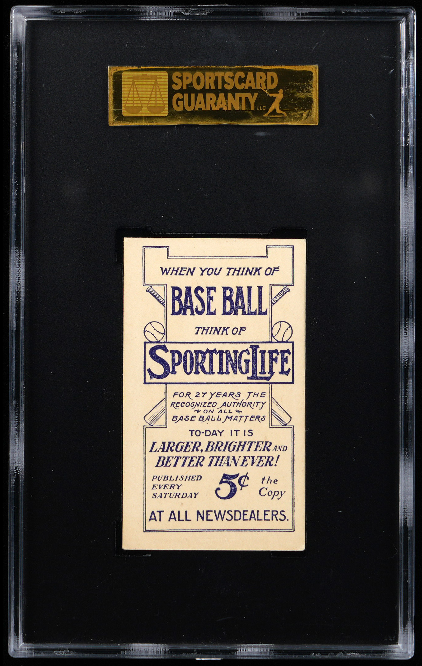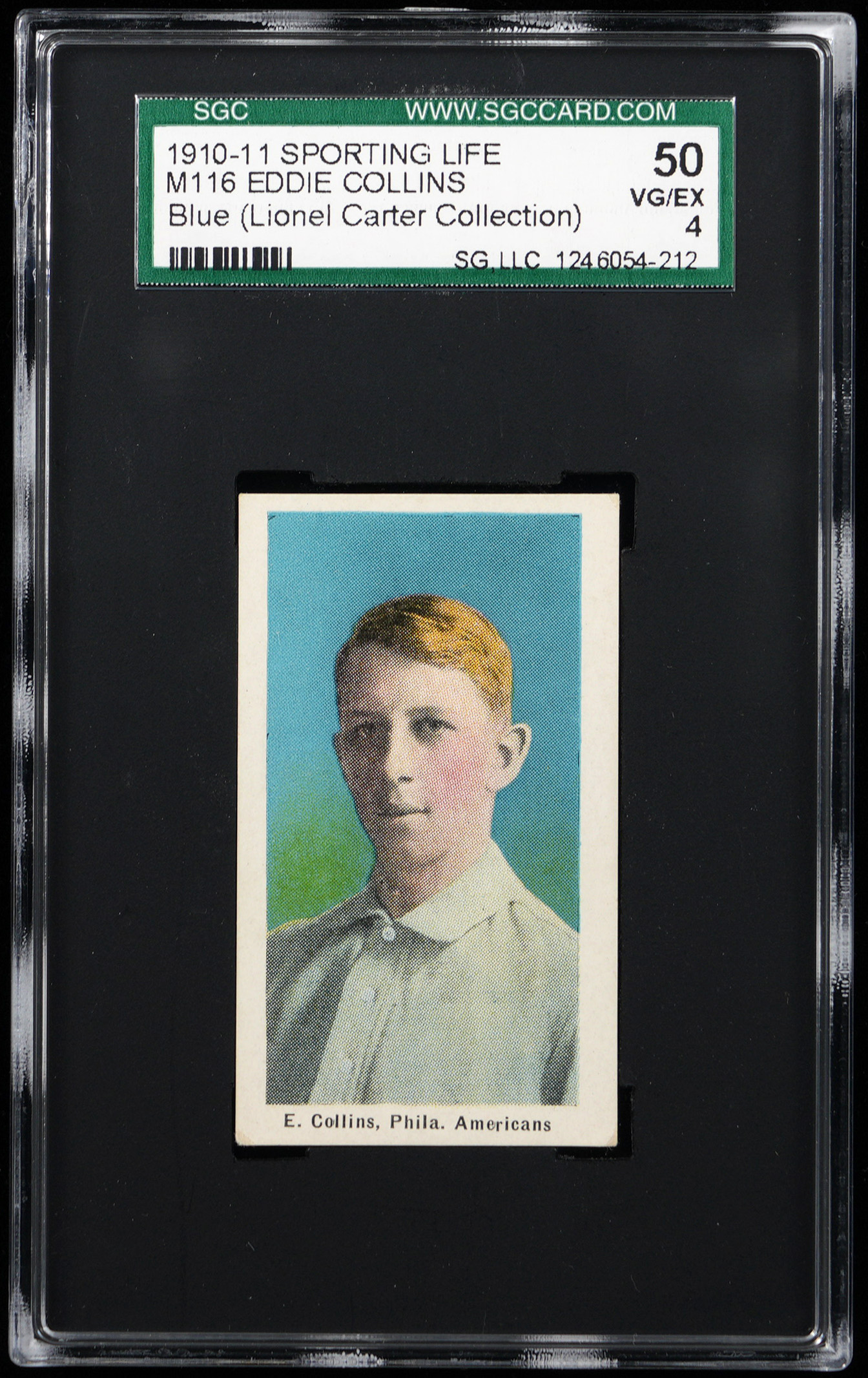 Graded VG/EX 4 by SGC. Philadelphia Athletics Hall of Famer Eddie Collins (Blue Background) version. Lionel Carter Collection flip provenance. Part of a larger 1910-1911 M116 Sporting Life near set break available throughout this auction.
