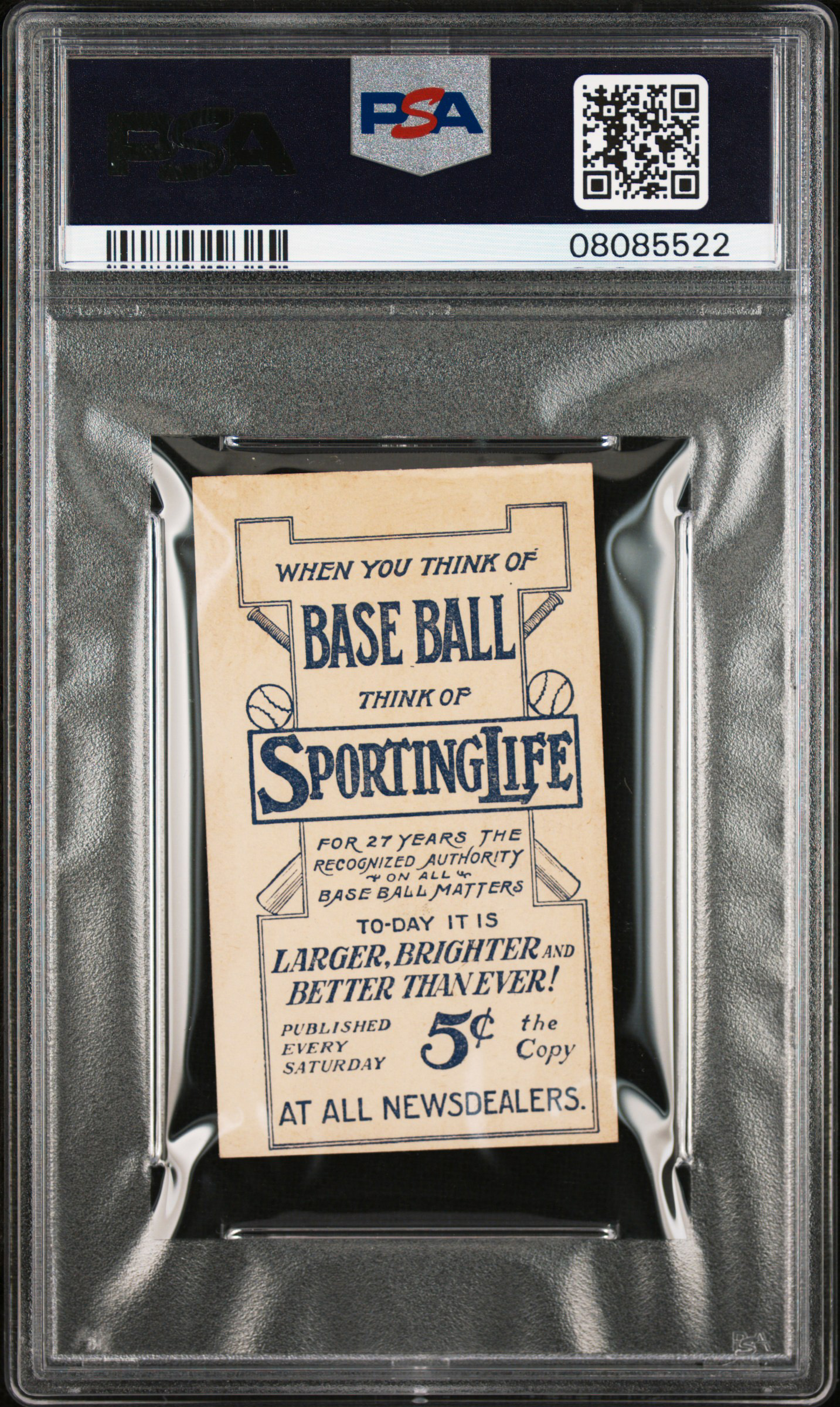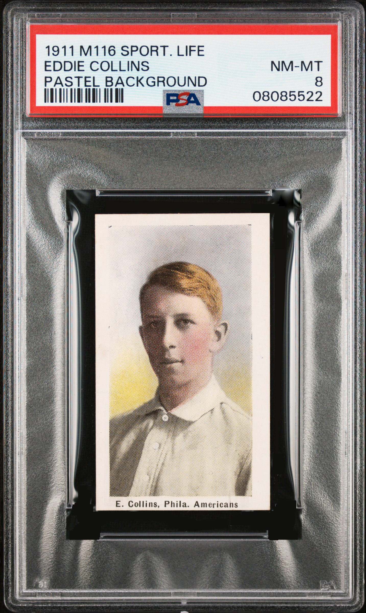 Graded NM-MT 8 by PSA. Philadelphia Athletics Hall of Famer Eddie Collins Pastel Background variant. This timeless pose of "Cocky," which is also found in the 1909-1911 T206 White Border series, features crystal clear imagery and striking visual accents. Of the 81 total copies of the player/background color combination judged by PSA, this 114-year-old relic survives as 1 of 4 at the grading level with only one better (top 6%).