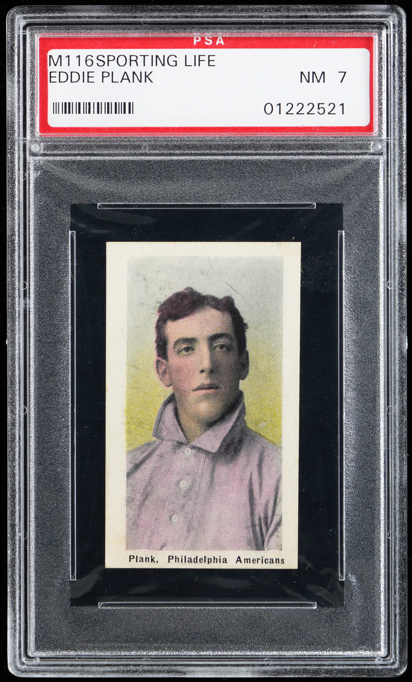 Graded NM 7 by PSA. Released during the same season as the 1909-1911 T206 White Border "Big Four" rarity, the offered 1911 M116 Sporting Life Eddie Plank features the same Carl Horner portrait from the same season at a more reachable price point. This instantly recognizable depiction of the Philadelphia Athletics Hall of Fame pitcher survives as 1 of 9 at the grading level with only two better (top 22%). Part of a larger 1910-1911 M116 Sporting Life near set available throughout this auction.