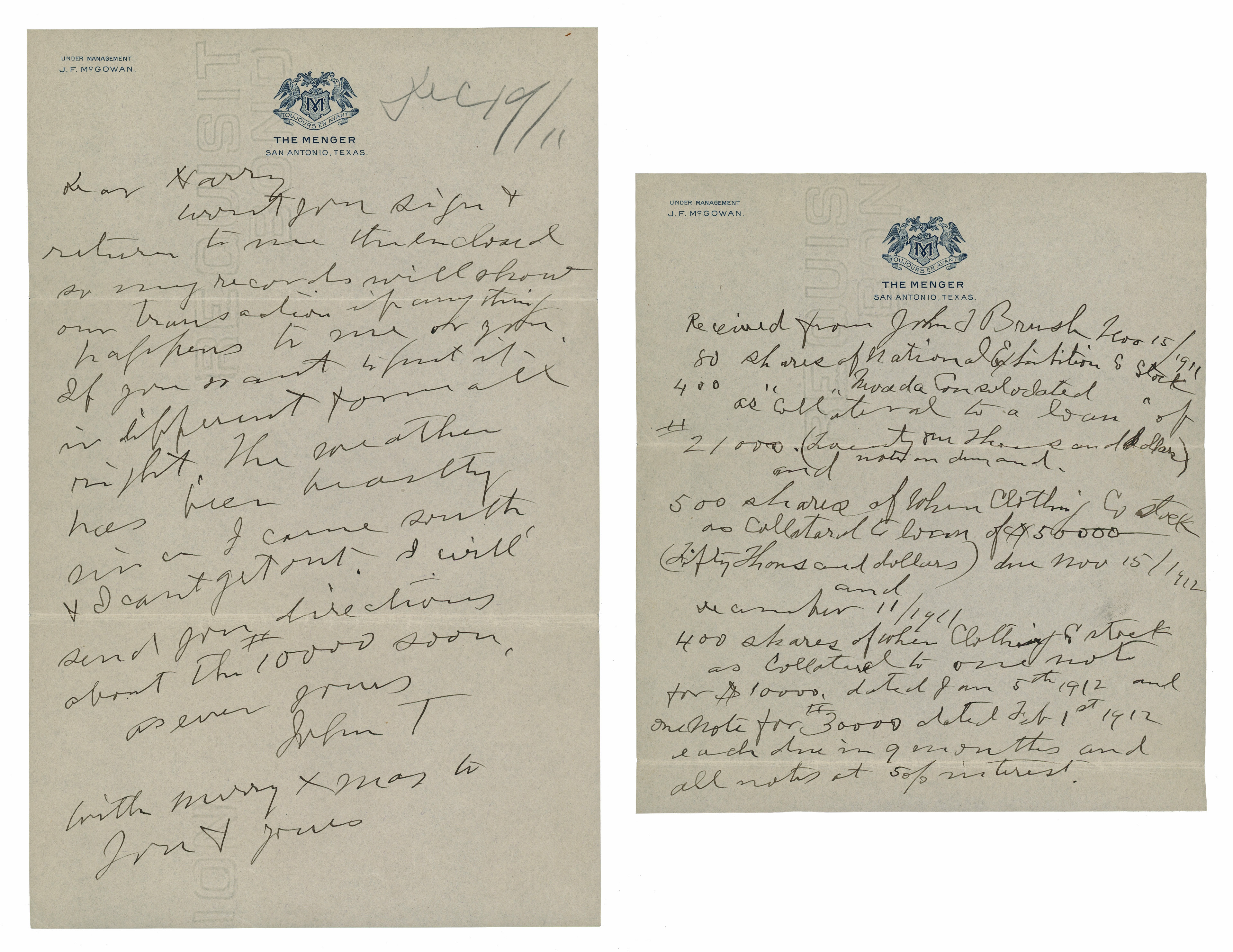 This letter is addressed to "Dear Harry", which could be his son-in-law Harry Hempstead, who succeeded Brush as president of the Giants. Ominously, this letter opens with the passage "Would you sign & return to me the enclosed so my records will show our transaction if anything happens to me or you". Brush has signed this letter familiarly as "John T", by means of a steel-tip fountain pen with ("8.5") potency, and he concluded his correspondence with a holiday greeting postscript. An accompany page, also written on The Menger letterhead, lists a series of stock share totals offered as collateral for large sum loans at 5% interest. The companies named are Brush's Indianapolis department store When Clothing, National Exhibition & Stock, and Nevada Consolidated, which may have been a mining concern. Showing due dates in the year 1912, this stock list page is absent its bottom-third, which has been clipped off. The removed section detailed dates for sending checks to Brush.