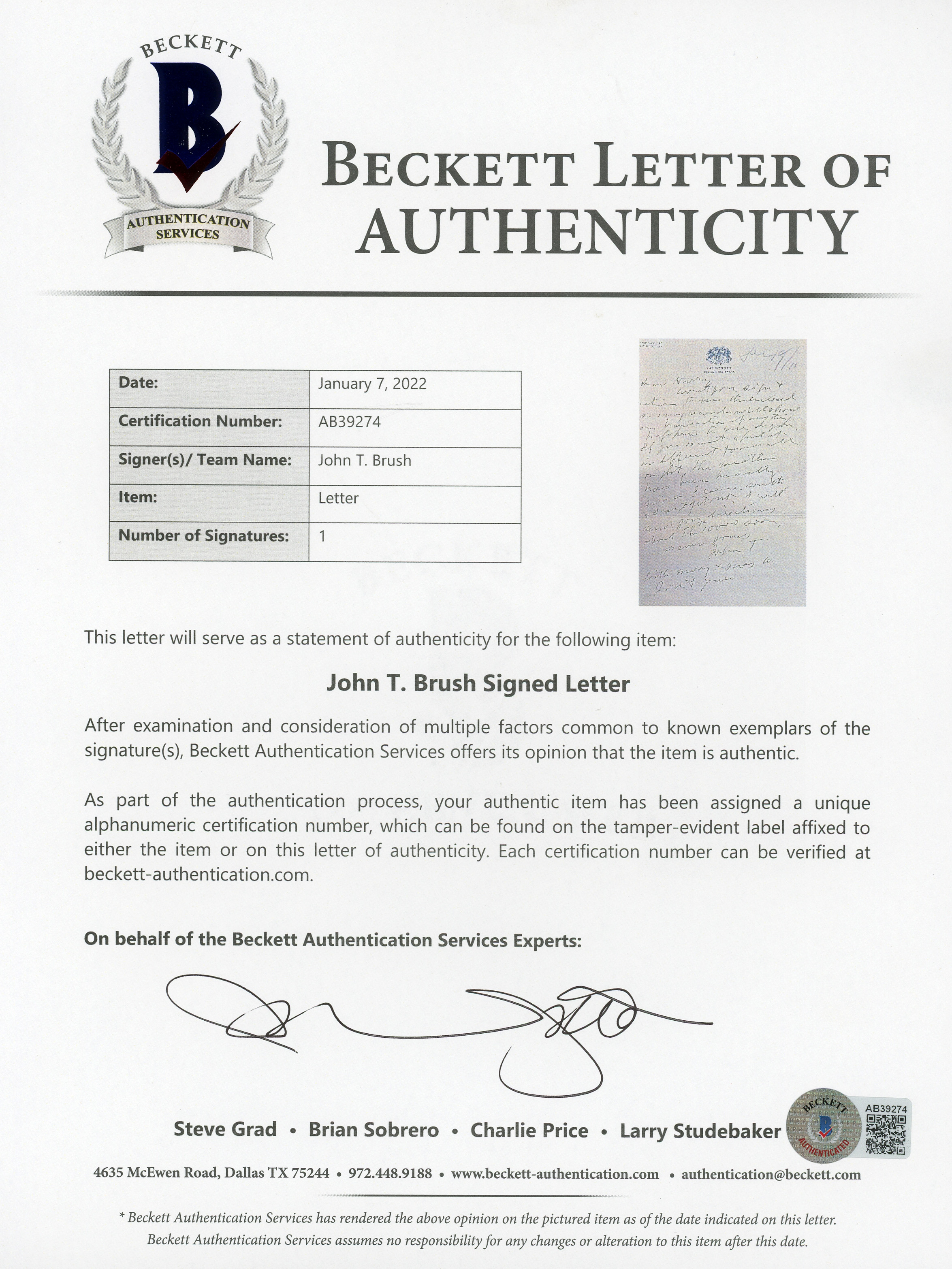 Financial correspondence from the distant past signed by New York Giants owner John T. Brush surfaces, with this 1911 handwritten letter. Appearing on The Menger hotel of San Antonio stationary, this ancient letter is dated 12/19/11. Suffering failing health, the iron-willed Brush ordered the reconstruction of the Polo Grounds, after a fire decimated the stadium in April of 1911. Brush battled illness, and hung on until November of 1912, when he died in his private train car, as he was headed west for recuperation.