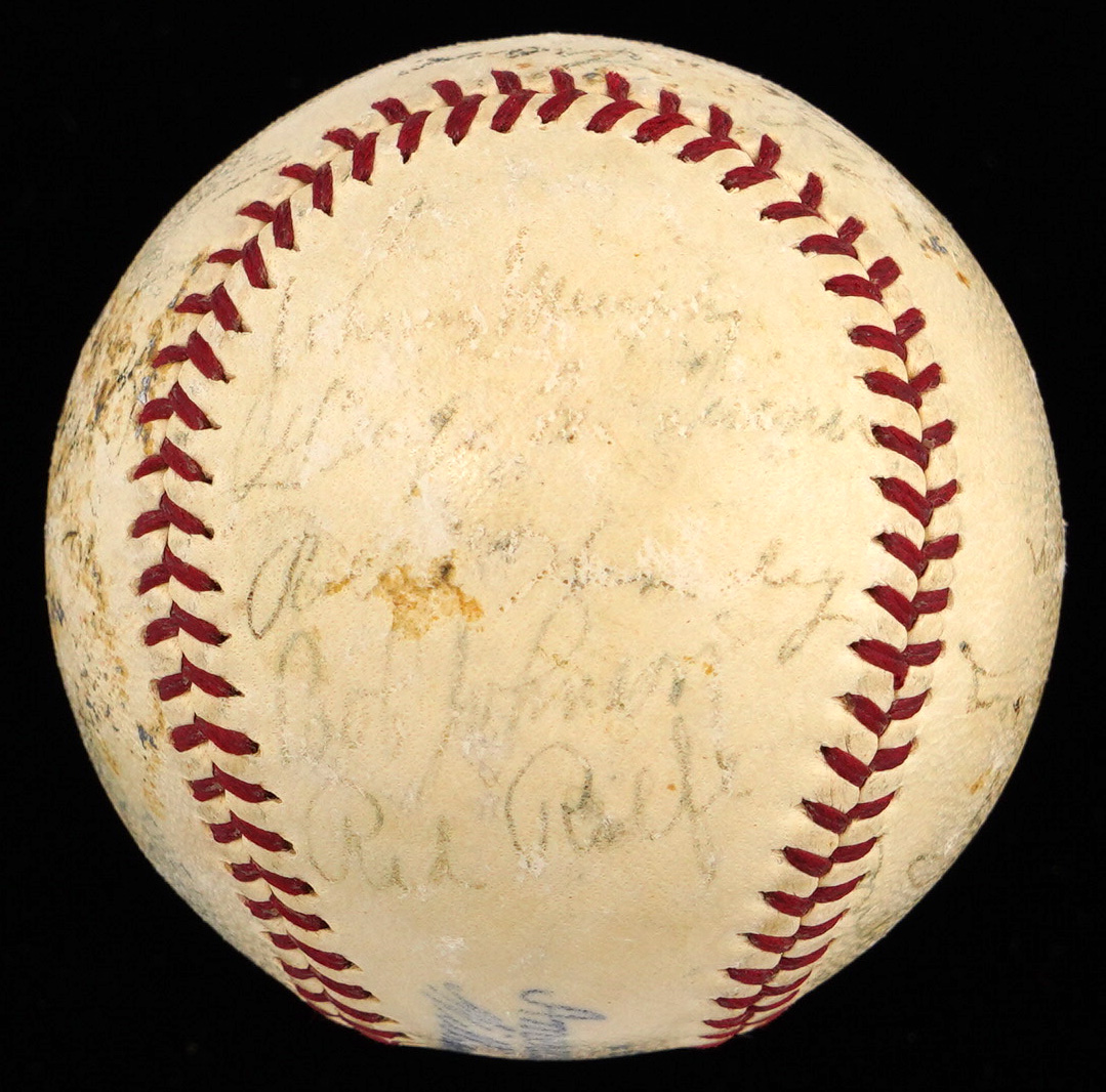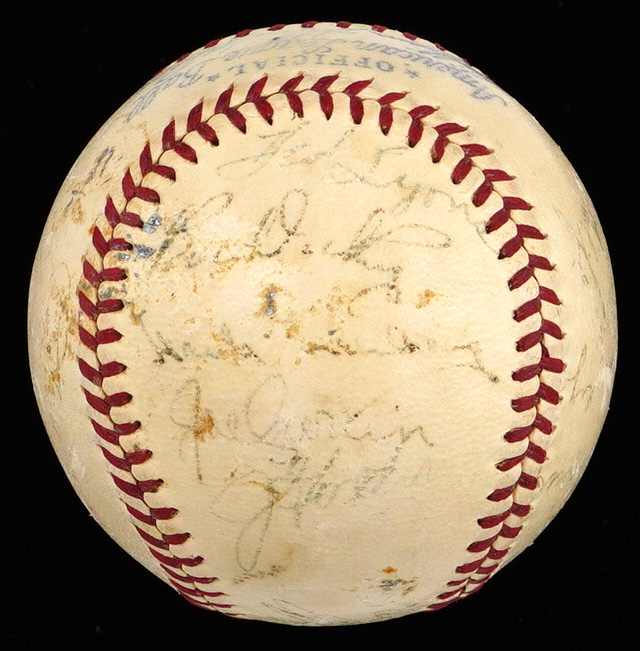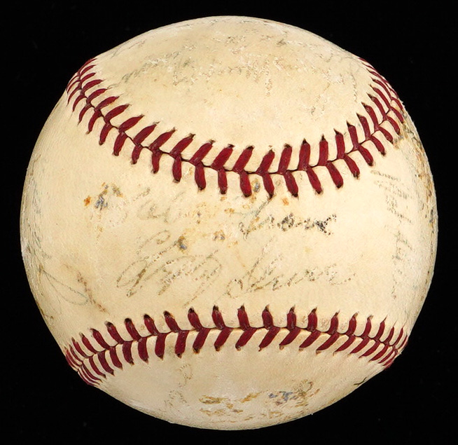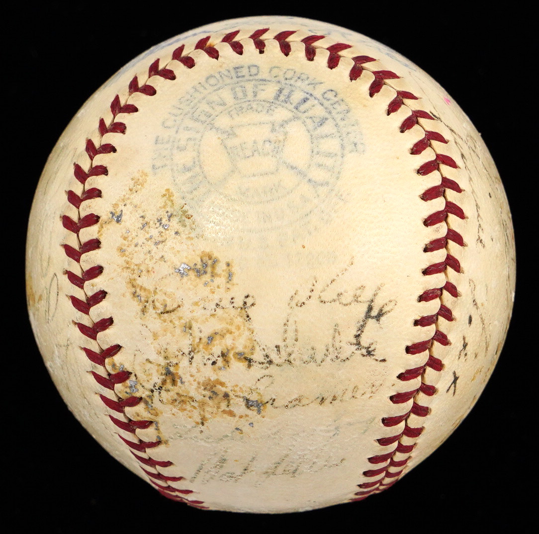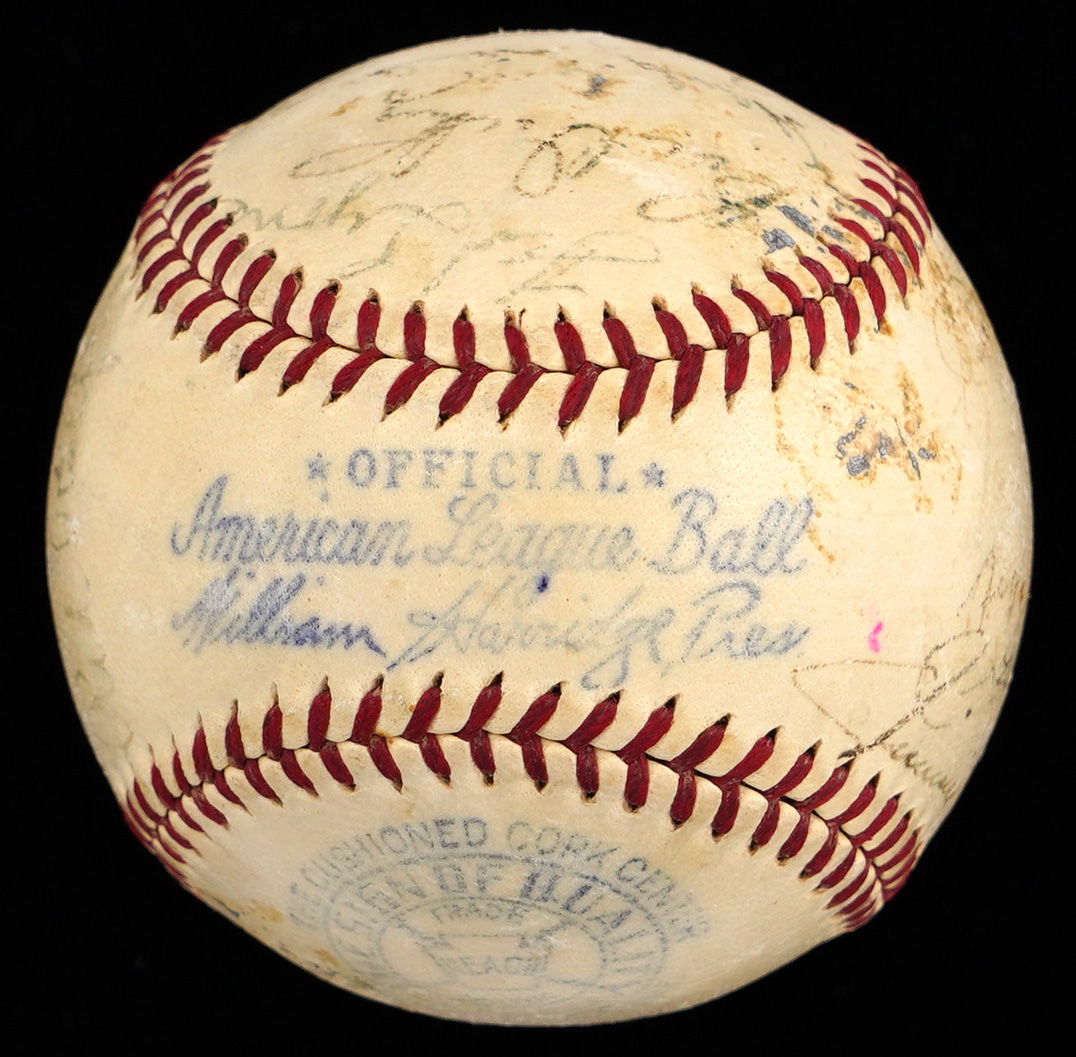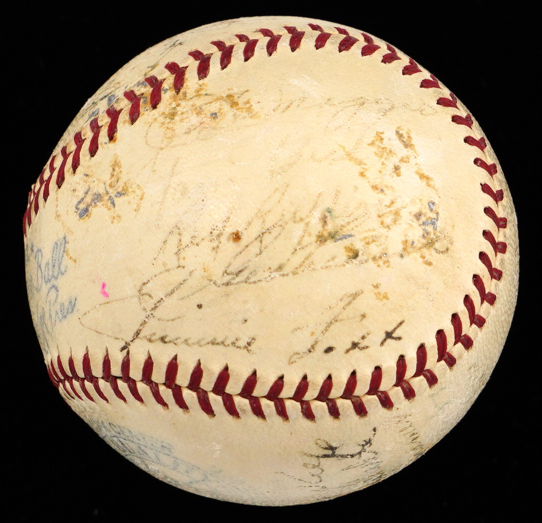 It was a lucky 7th playing of the All-Star Game for the American Leaguers, when they participated in the period signing of the offered OAL/Harridge baseball. The AL squad came out on top of a tight contest, winning by a score of 3-1. The venue turned out to be even luckier for the hometown crowd, as Yankee Stadium hosted both the All-Star Game, and the World Series in 1939. The Yankees stars performed admirably in both of these main stage events, sweeping the World Series, and collecting half of the AL squad's six hits in the Mid-Summer Classic, including a 5th inning home run by Joe DiMaggio. While time has taken its toll on the (21) signatures covering the offered baseball, fortune has smiled on some of the biggest stars. The Jimmie Foxx signature stands out as the most distinct example, and those of Bill Dickey, Hank Greenberg, and Joe DiMaggio are easy to spot.