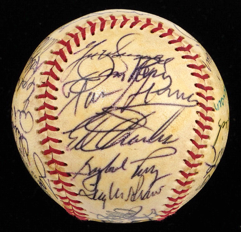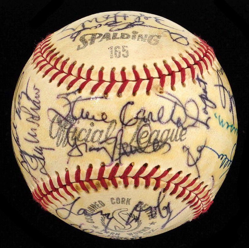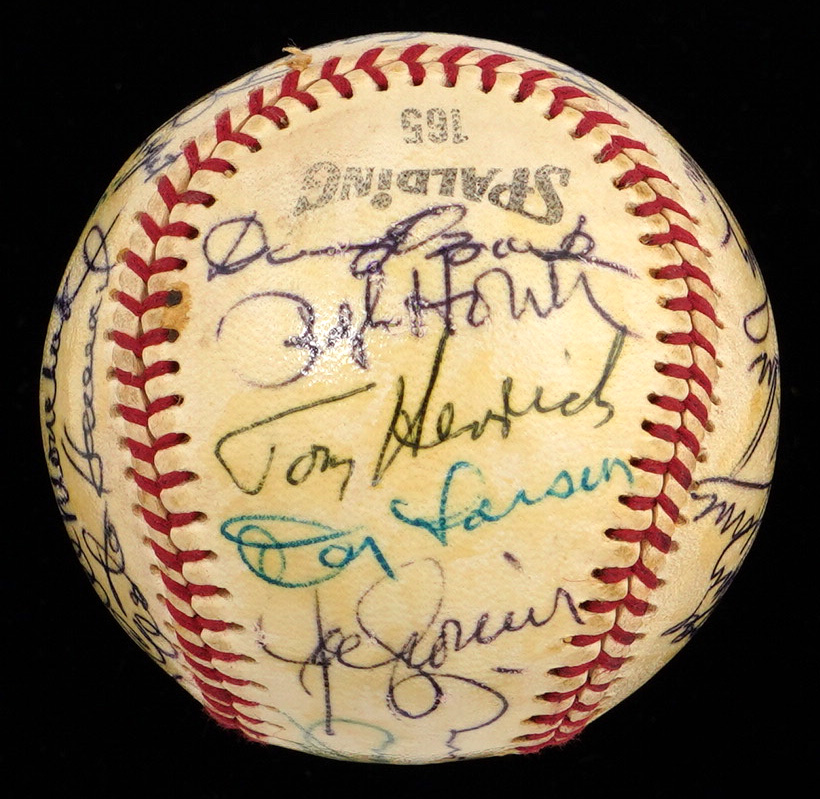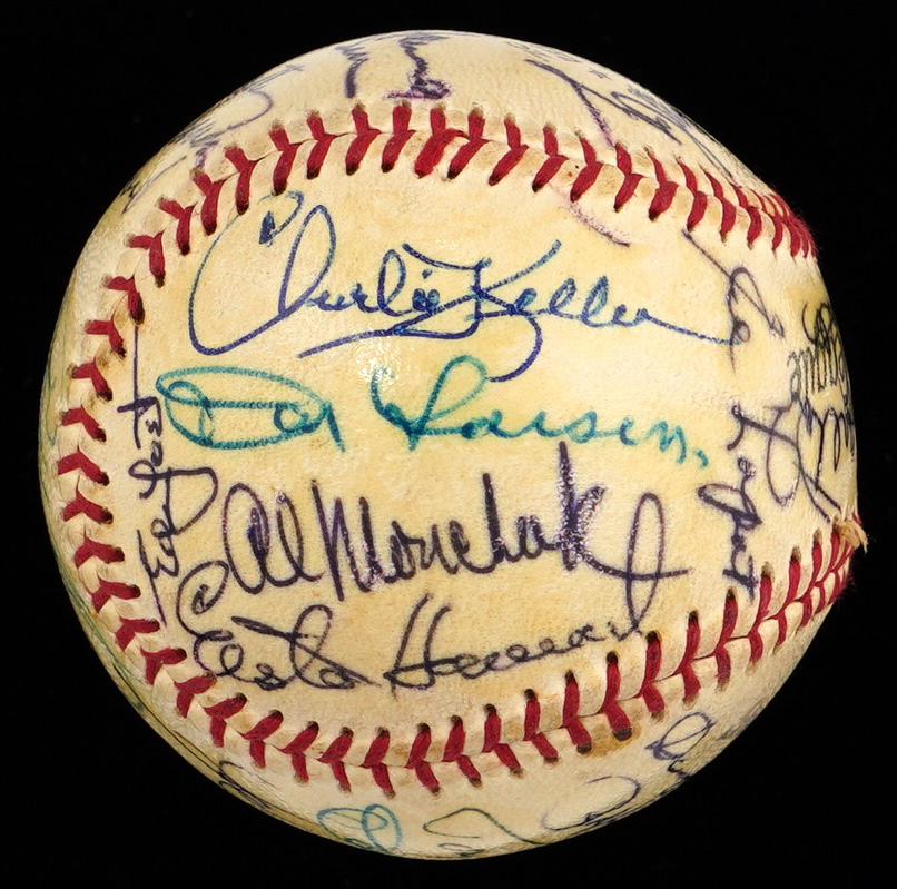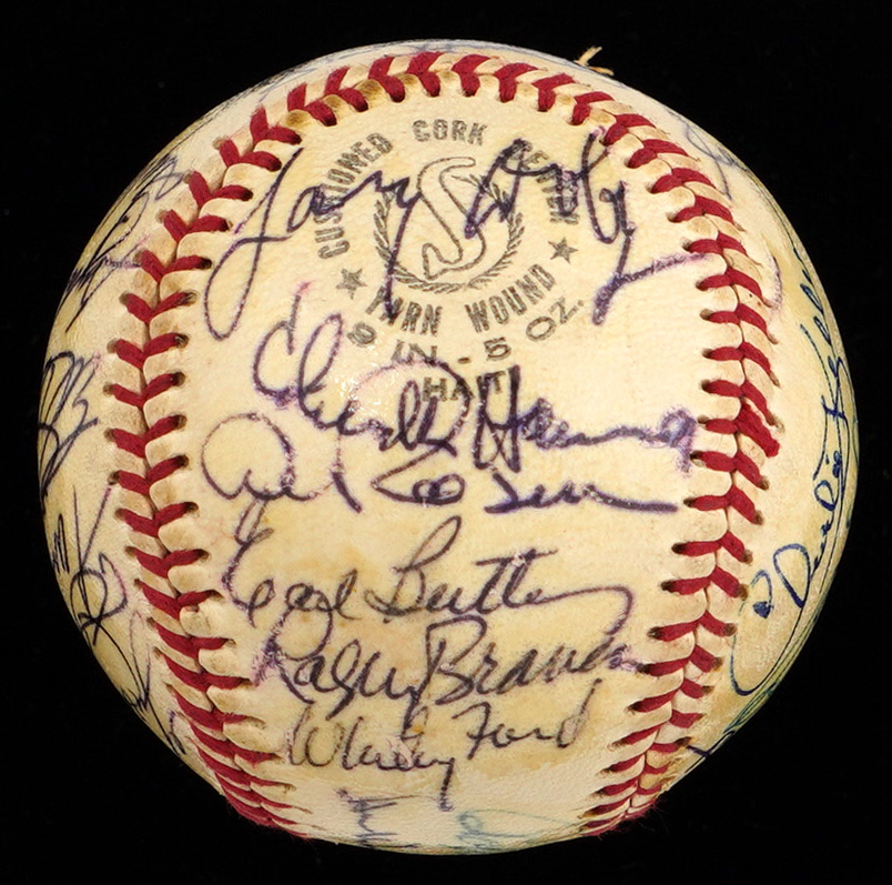 There's very little blank space on this multi-signed Spalding Official League baseball, because it's covered with bold signatures, applied at a 1970 Baseball Writers Association Dinner. A total of (27) autographs, including (7) Hall of Famers, have been protected by a coating of shellac, and most remain as firm as they day they were signed, fifty-five years ago.