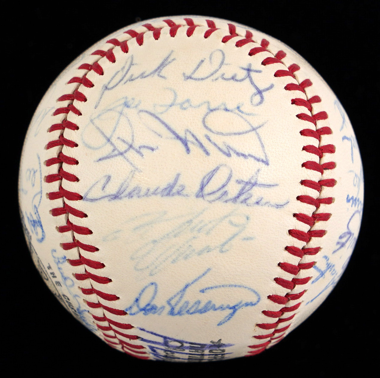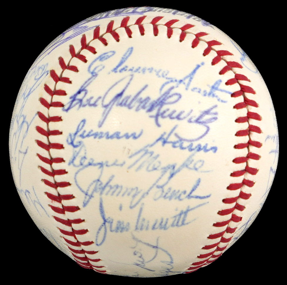 A stacked squad takes the field with this 1970 National League All-stars team-signed baseball. This handsome ONL/Feeney ball is decorate with (28) signatures, including a good number of true all-time greats. Signature quality varies from panel to panel, with the east panel signatures showing the most strength, while those on the west panel are considerably faded. The sweet spot, north panel and south panel signatures take the middle ground, with two exceptions, one stronger, and one weaker. Considering the caliber of the Hall of Famer and stars represented, and the fact that all signatures remain recognizable, this period signed 1970 NL All-Stars baseball stacks up a high value target.