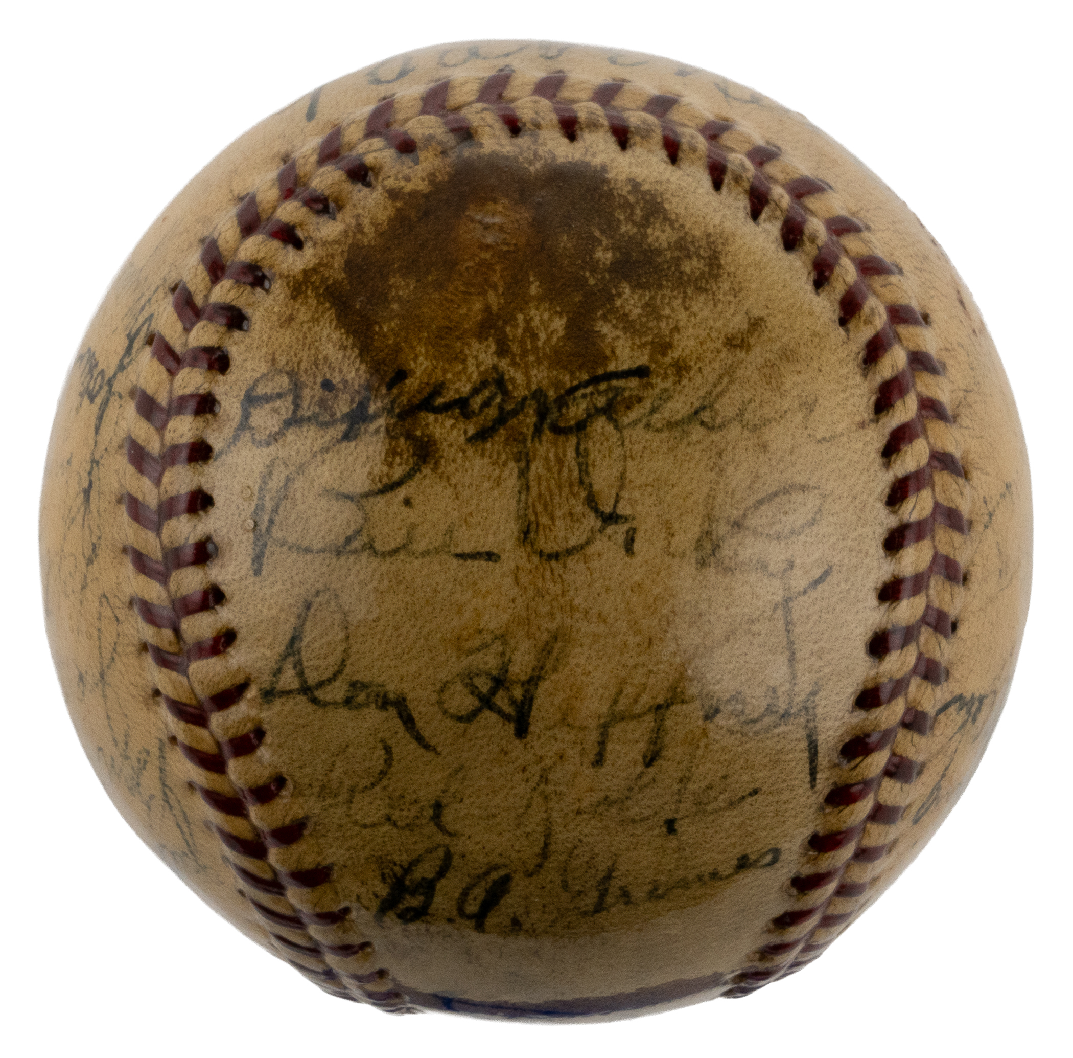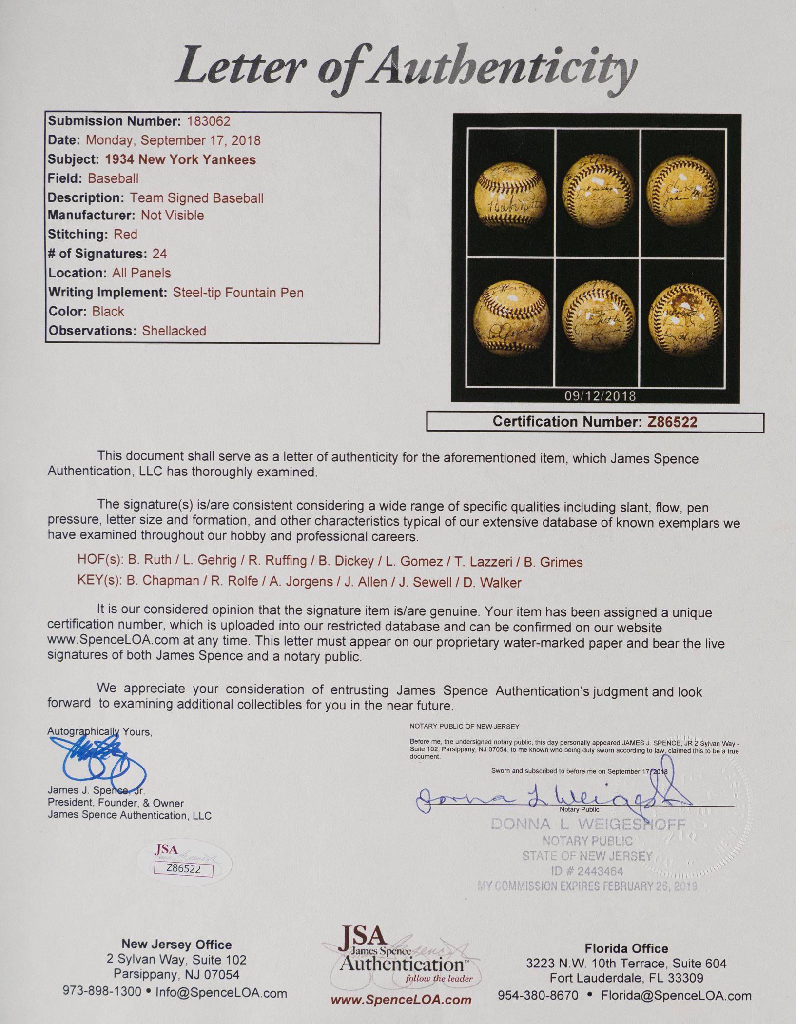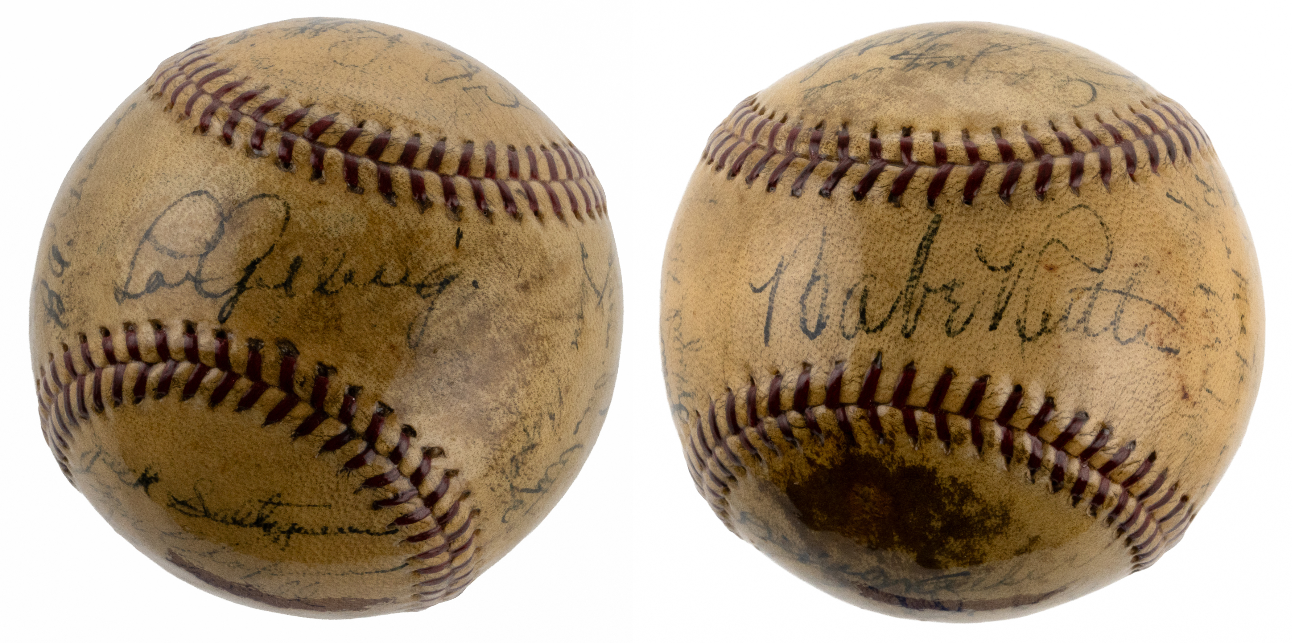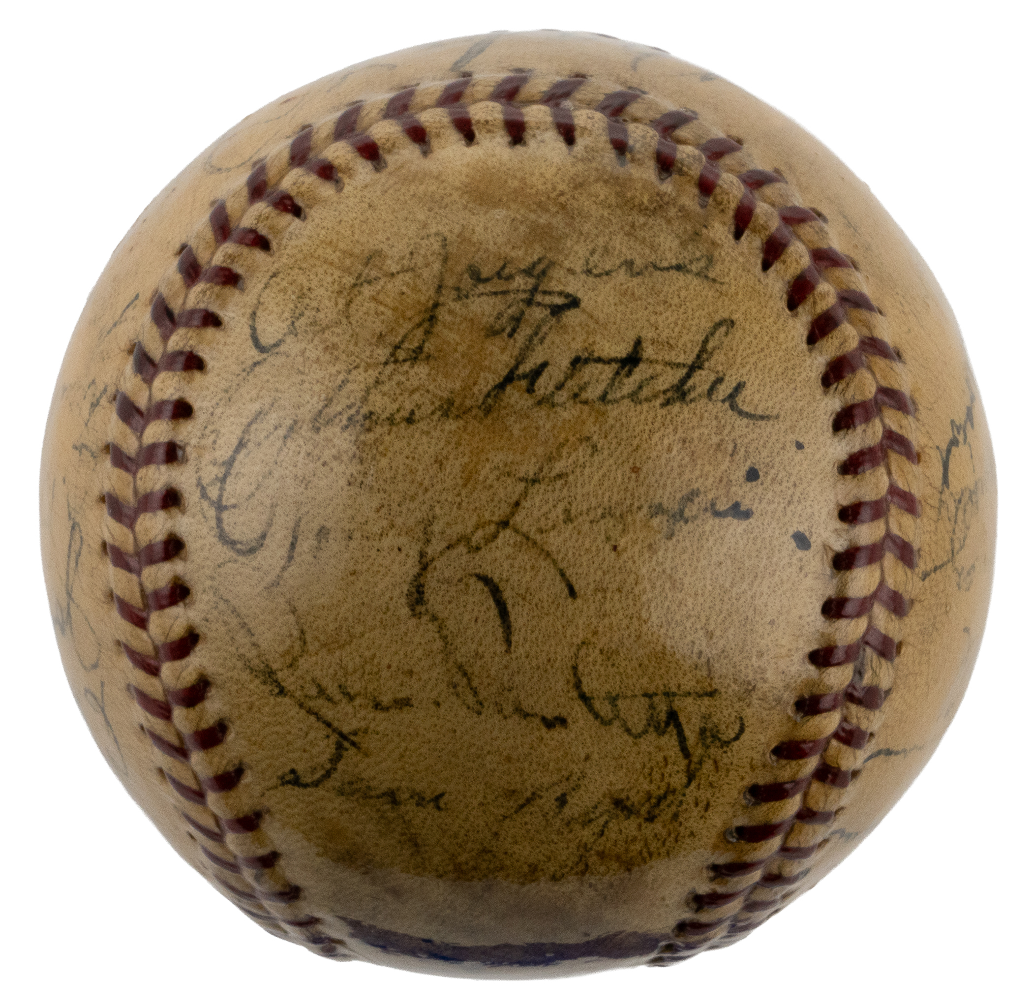 Outstanding team-signed baseball featuring twenty-four members of the 1934 New York Yankees, highlighted by eight Hall of Famers, including Babe Ruth and Lou Gehrig. Although the Yankees finished in second place in 1934, it marked a turning point in Gehrig's fabled career, as he finally emerged from Ruth's enormous shadow. For the first time ever Gehrig finally eclipsed Ruth in home runs, hitting a league-leading 49 to Ruth's 22. Gehrig also led the league in RBI (165) and batting average (.363), which earned him the coveted Triple Crown. The offered baseball is particularly special, and different from others we have offered, in that each of the signatures of Babe Ruth and Lou Gehrig is placed on alternating sweet spots, ideally positioning the two most important signers in areas of the baseball that allowed for large, bold signatures. In addition to Ruth and Gehrig, the ball features the signatures of Hall of Famers Red Ruffing, Lefty Gomez, Bill Dickey, Tony Lazzeri, Burleigh Grimes, and Joe Sewell (coach). Each of the signatures is executed in black ink, and the ball has been coated with a protective layer of shellac. There are no manufacturer's stampings visible. There is some minor discoloration throughout the ball, including a moderately-sized stain on one panel affecting only a single signature, but it does not detract from the overall presentable quality of this baseball. This is a superb memento from this New York Yankees team full of stars and Hall of Famers! Full LOA from James Spence/JSA.