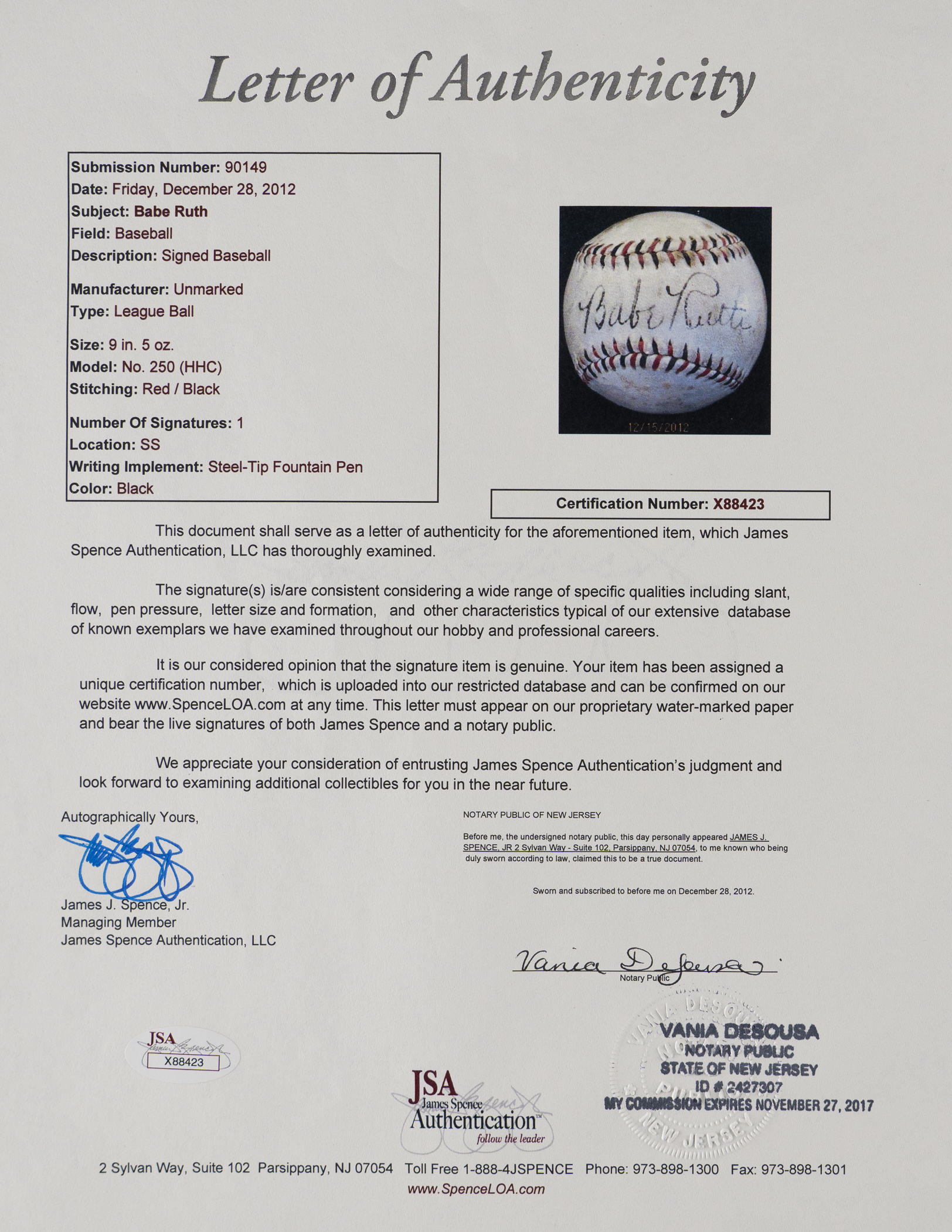 Full LOA from James Spence/JSA.
