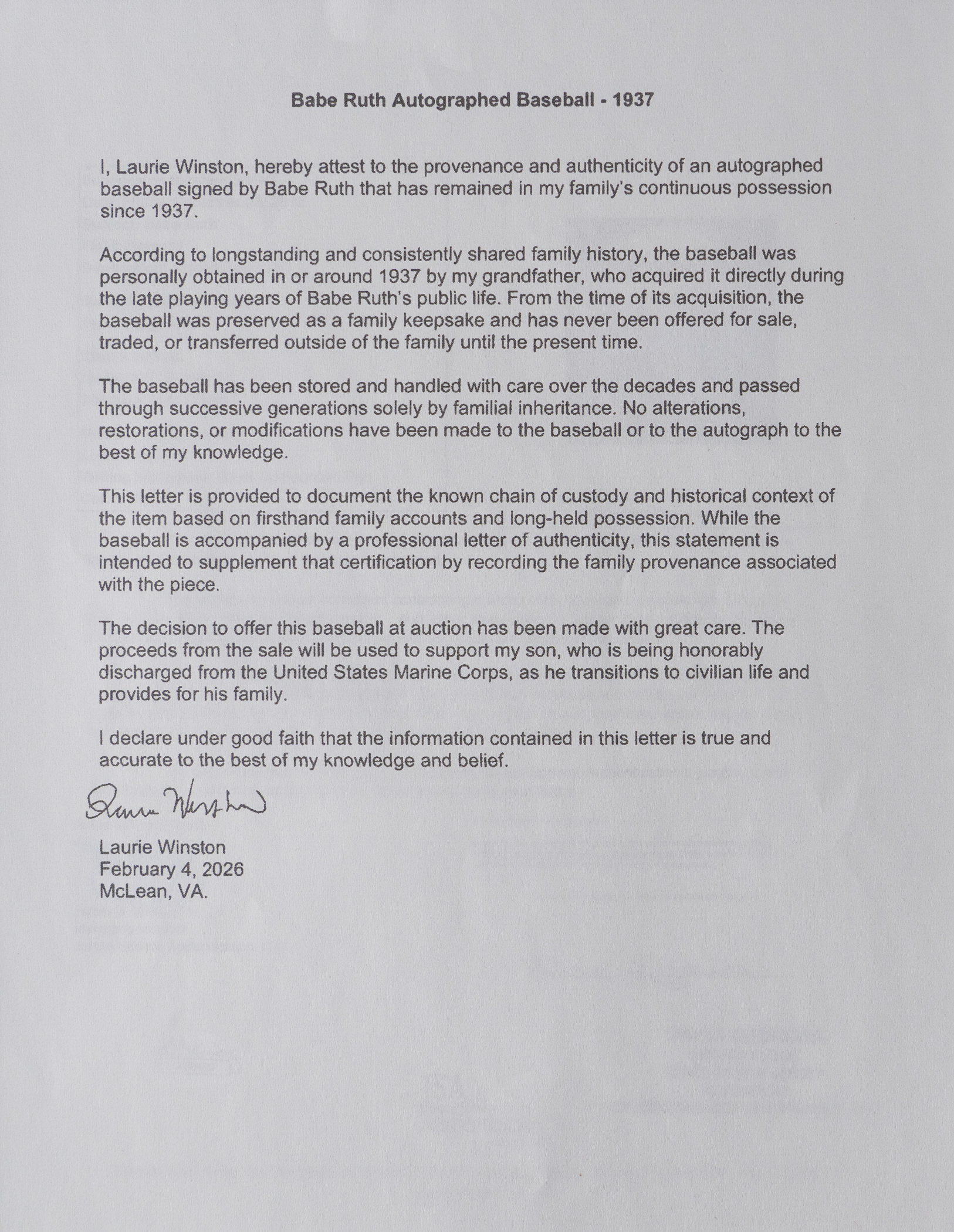 A magnificent treasure comes to market for the first time ever, with the presentation of this circa 1937 “Babe” Ruth single-signed baseball. An accompanying letter of provenance declares this baseball has remained in continuous possession of the same family, since the consignor’s grandfather originally obtained Ruth’s signature on it approximately ninety years ago. It was a tough decision to let it go, but it's going to make a new owner very happy indeed.