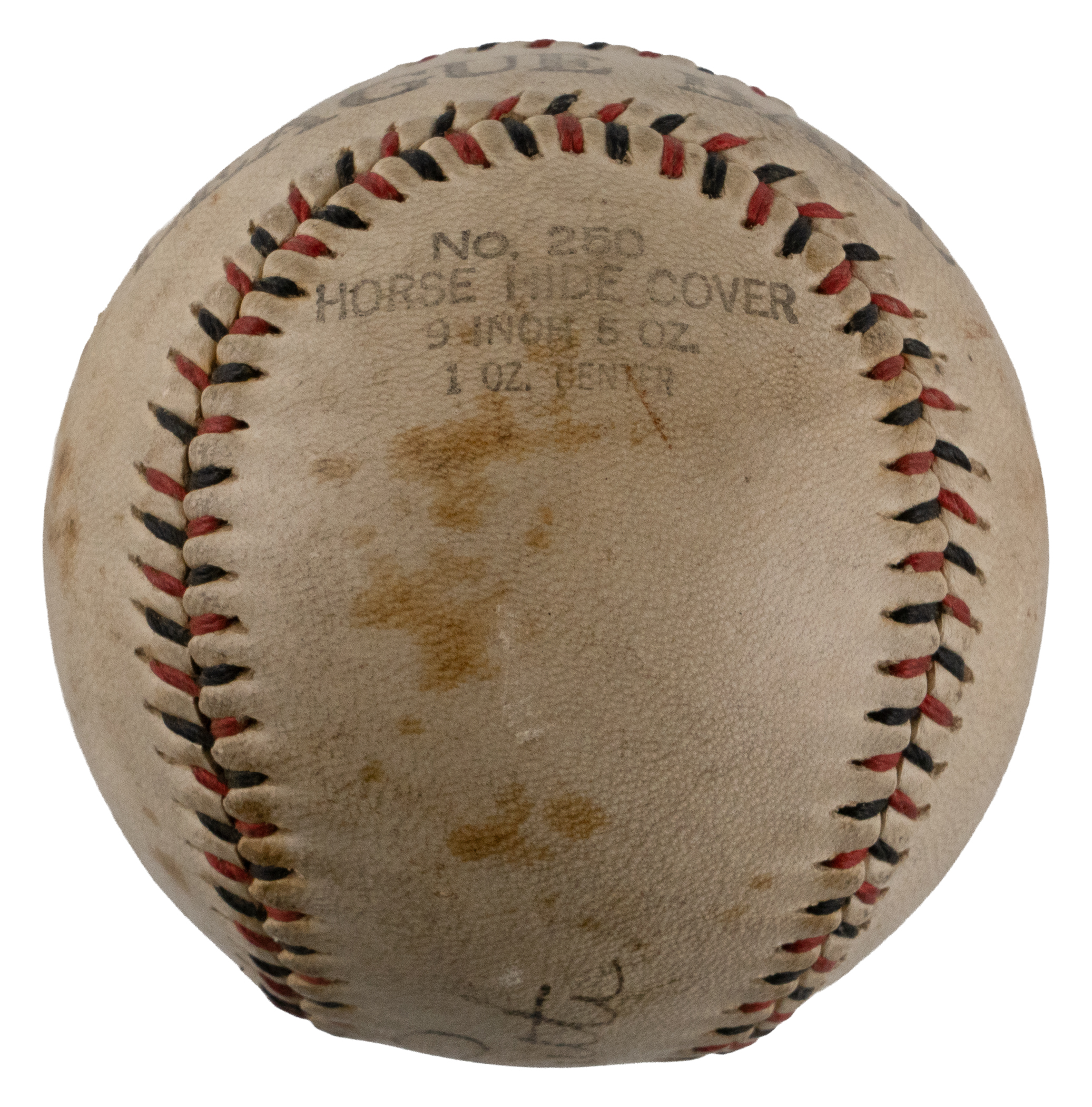 No factory brand labeling is visible on this vintage baseball, though the simple legend “League Ball” covers the reverse sweet spot. Specifications on an adjacent panel include “No. 250” for the model number. Ruth has neatly applied his greatly coveted signature on the preferred sweet spot location. After all these years, his black steel-tip fountain pen signature remains distinct and satisfying. The baseball radiates period authenticity, and display appeal is off the charts.