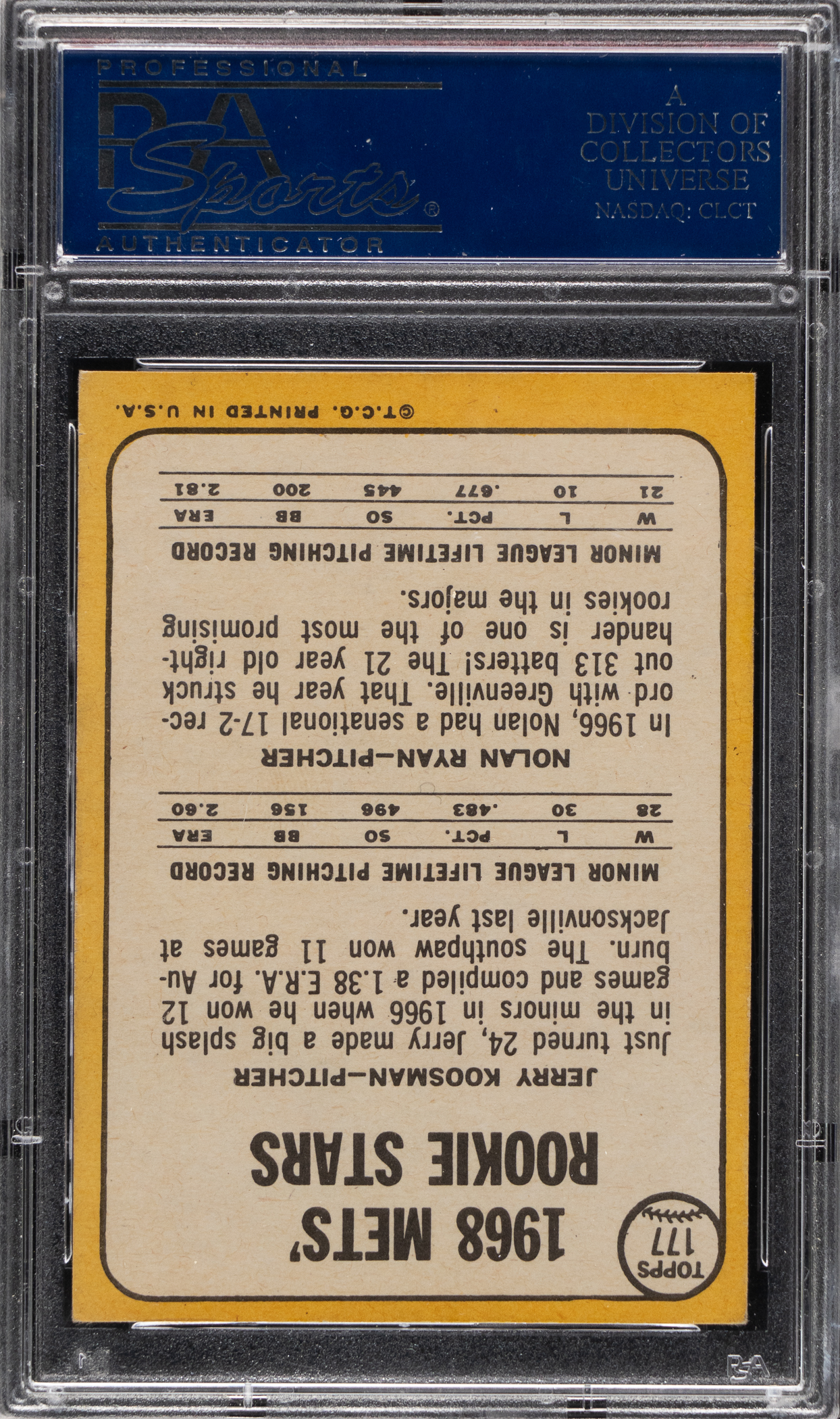 Graded NM-MT 8 by PSA. Flamethrower Nolan Ryan commands the offered 1968 Topps #177 rookie card. A truly elite copy of the New York Mets Hall of Famer that exhibits razor-sharp corners, accurate centering and "picture perfect" surface registration. The player/background color schemes present as when produced over a half-century ago. Additionally, the reverse which details Ryan's dominating fastball is bright and clean. Ranks in the upper 4.6% of all similar copies judged by the authenticator.
